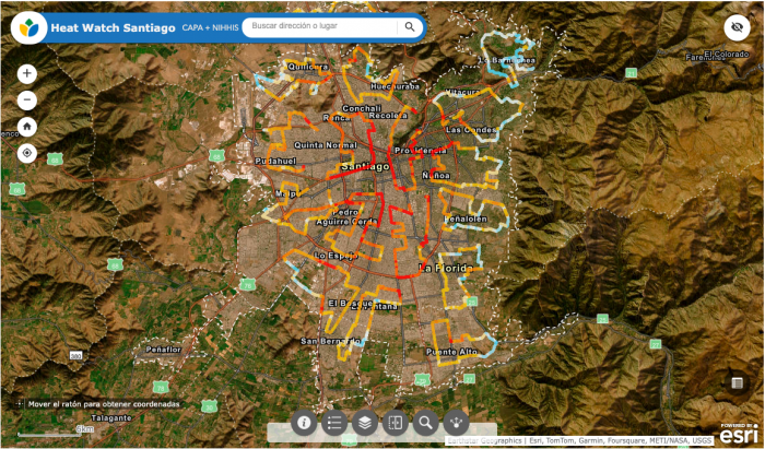 A través de un visor interactivo, según consigna la plataforma, las personas pueden visualizar cómo se distribuye el calor en Santiago durante un día de calor extremo. Estos mapas fueron desarrollados con modelos de machine learning que integran las mediciones empíricas en terreno con datos satelitales.