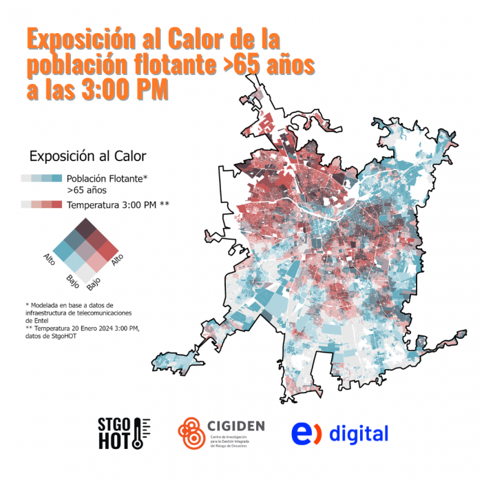Las investigadoras desarrollaron mapas de calor, integrando los datos de población flotante de Crowds de Entel Digital, que muestran dónde está la población en distintas horas del día, y datos de temperatura recopilados en el marco del proyecto SantiagoHOT durante enero del 2024. La unión de ambas plataformas permitió identificar detalladamente zonas de alta exposición del calor, junto a su variabilidad espacial y temporal en la ciudad. Incluso, presenta datos más específicos, como, por ejemplo, dónde se encuentran principalmente las personas mayores de 65 años.