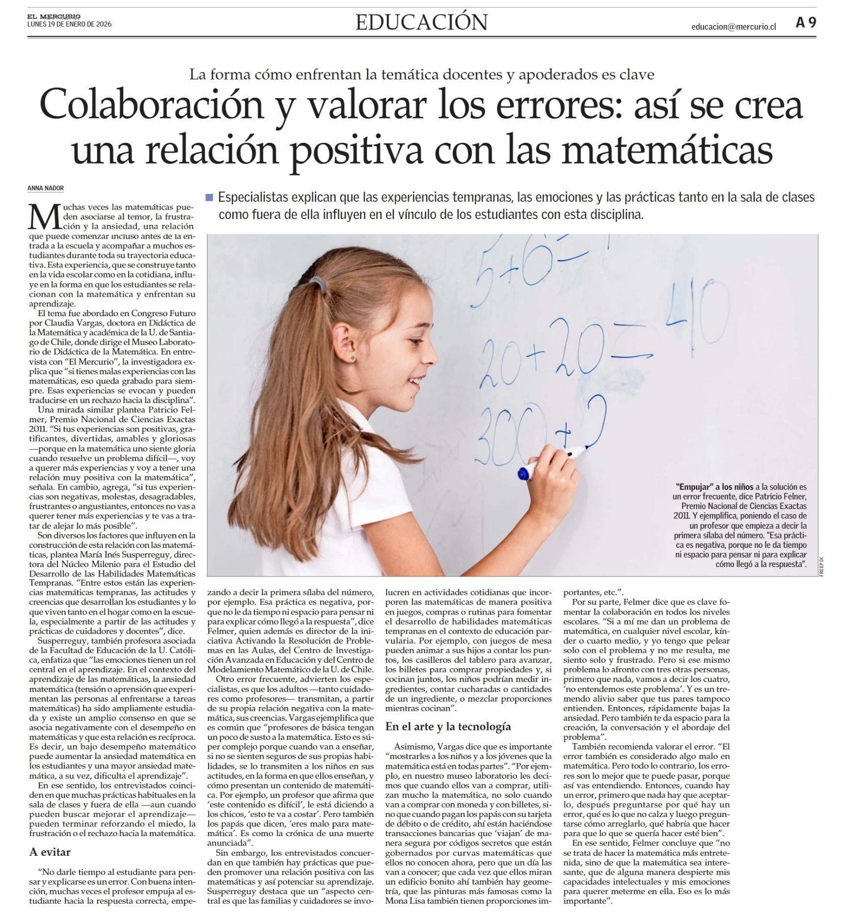 Susperreguy, también profesora asociada de la Facultad de Educación de la U. Católica, enfatiza que “las emociones tienen un rol central en el aprendizaje. En el contexto del aprendizaje de las matemáticas, la ansiedad matemática (tensión o aprensión que experimentan las personas al enfrentarse a tareas matemáticas) ha sido ampliamente estudiada y existe un amplio consenso en que se asocia negativamente con el desempeño en matemáticas y que esta relación es recíproca. Es decir, un bajo desempeño matemático puede aumentar la ansiedad matemática en los estudiantes y una mayor ansiedad matemática, a su vez, dificulta el aprendizaje”. (...)