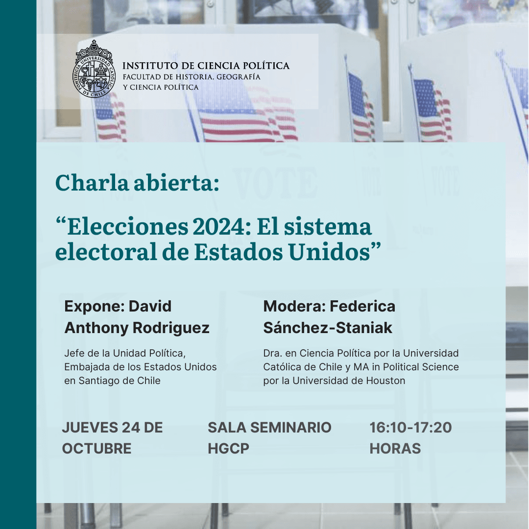 El evento es una charla abierta organizada por el Instituto de Ciencia Política de la Facultad de Historia, Geografía y Ciencia Política de la Pontificia Universidad Católica de Chile. La charla, titulada "Elecciones 2024: El sistema electoral de Estados Unidos", busca analizar y explicar el funcionamiento del sistema electoral estadounidense de cara a las próximas elecciones presidenciales.