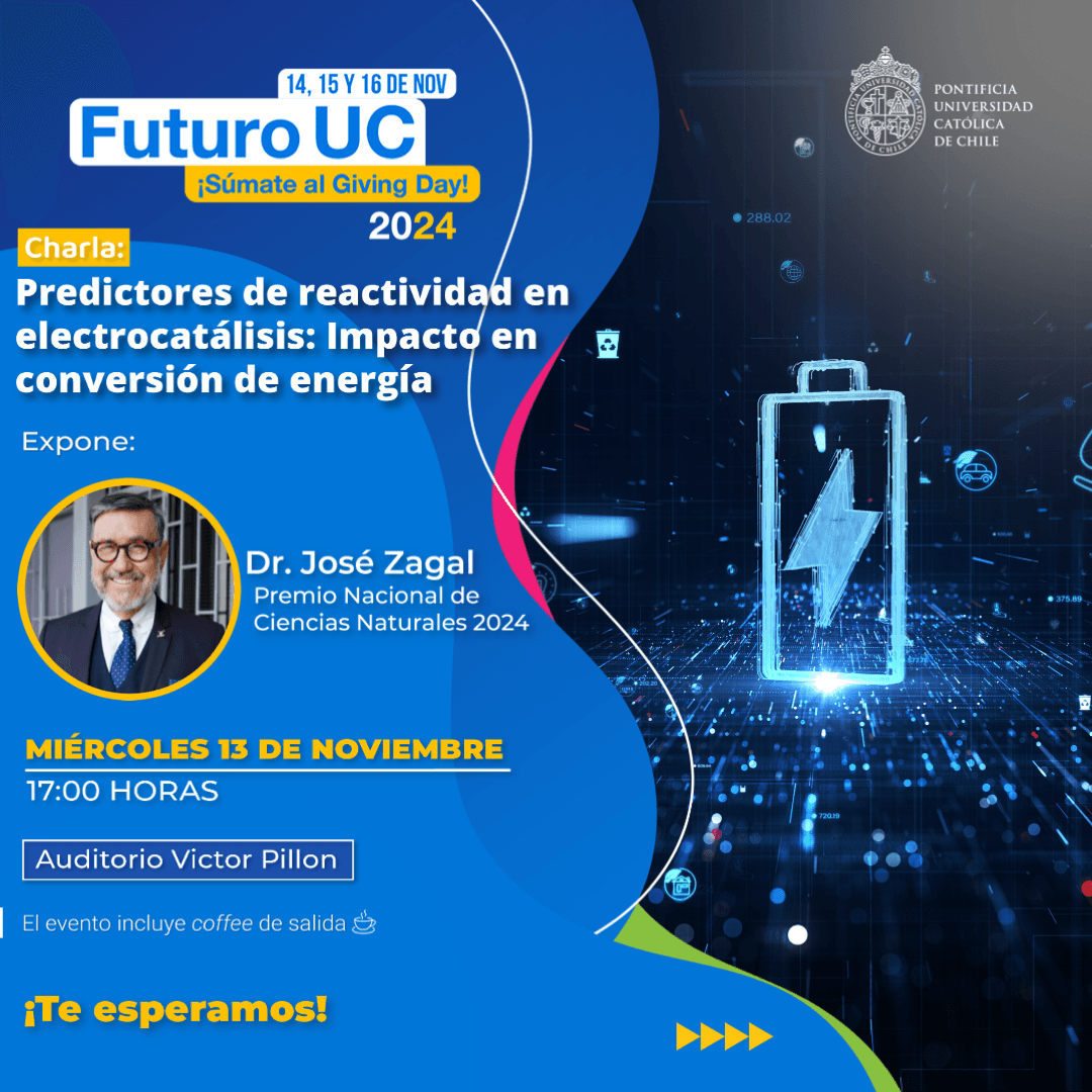 Este 13 de noviembre no te puedes perder “Predictores de reactividad en electrocatálisis: Impacto en conversión de energía”, charla magistral que dictará el Premio Nacional de Ciencias Naturales 2024, Dr. José Zagal Moya.