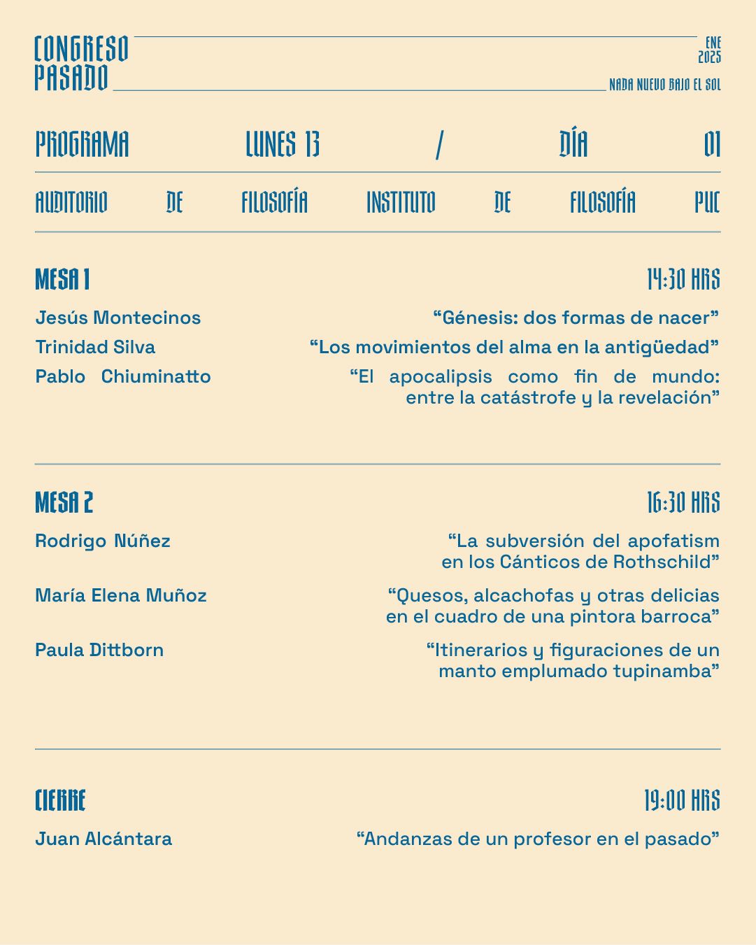 El II Congreso "Pasado" reúne a destacados expertos en un evento único que invita a reflexionar sobre las distintas perspectivas de la historia, la filosofía y la literatura. Este congreso se llevará a cabo entre el 13 y 14 de enero de 2025, en diversos espacios académicos de la Pontificia Universidad Católica de Chile y la Universidad de Santiago de Chile. El lunes 13 de enero, el Congreso comenzará a las 14:30 hrs. en el Auditorio Filosofía de la Pontificia Universidad Católica (PUC), con charlas sobre temas como "Génesis: dos formas de nacer" de María Jesús Montecinos, "Los movimientos del alma en la antigüedad" de Trinidad Silva, y "El apocalipsis como fin de mundo: entre la catástrofe y la revelación" de Pablo Chiuminatto. A las 16:30 hrs., se presentarán otros conferencistas como Rodrigo Núñez, María Elena Muñoz y Paula Dittborn, quienes explorarán temas tan fascinantes como "La subversión del apofatismo en los Cánticos de Rothschild" y "Quesos, alcachofas y otras delicias en el cuadro de una pintora barroca".