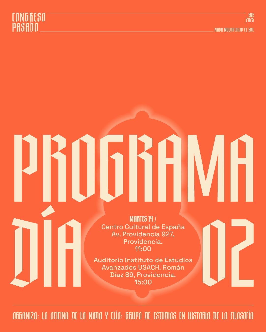 El martes 14 de enero, el evento continuará con conferencias en el Centro Cultural de España y el Auditorio del Instituto de Estudios Avanzados de la USACH. En la mañana, Gina Allende presentará su ponencia "¿Alturas y ritmos? ¿Qué nos dicen realmente las partituras de los siglos XVI y XVII?", seguida de una performance junto a Cussen & Luna. La tarde estará llena de interesantes exposiciones, como "Materialismo mágico con Giordano Bruno" de Valentina Bulo y "Iconografía de la protesta y usos del pasado reciente: 18 de octubre y la revuelta social" de Cristina Moyano.