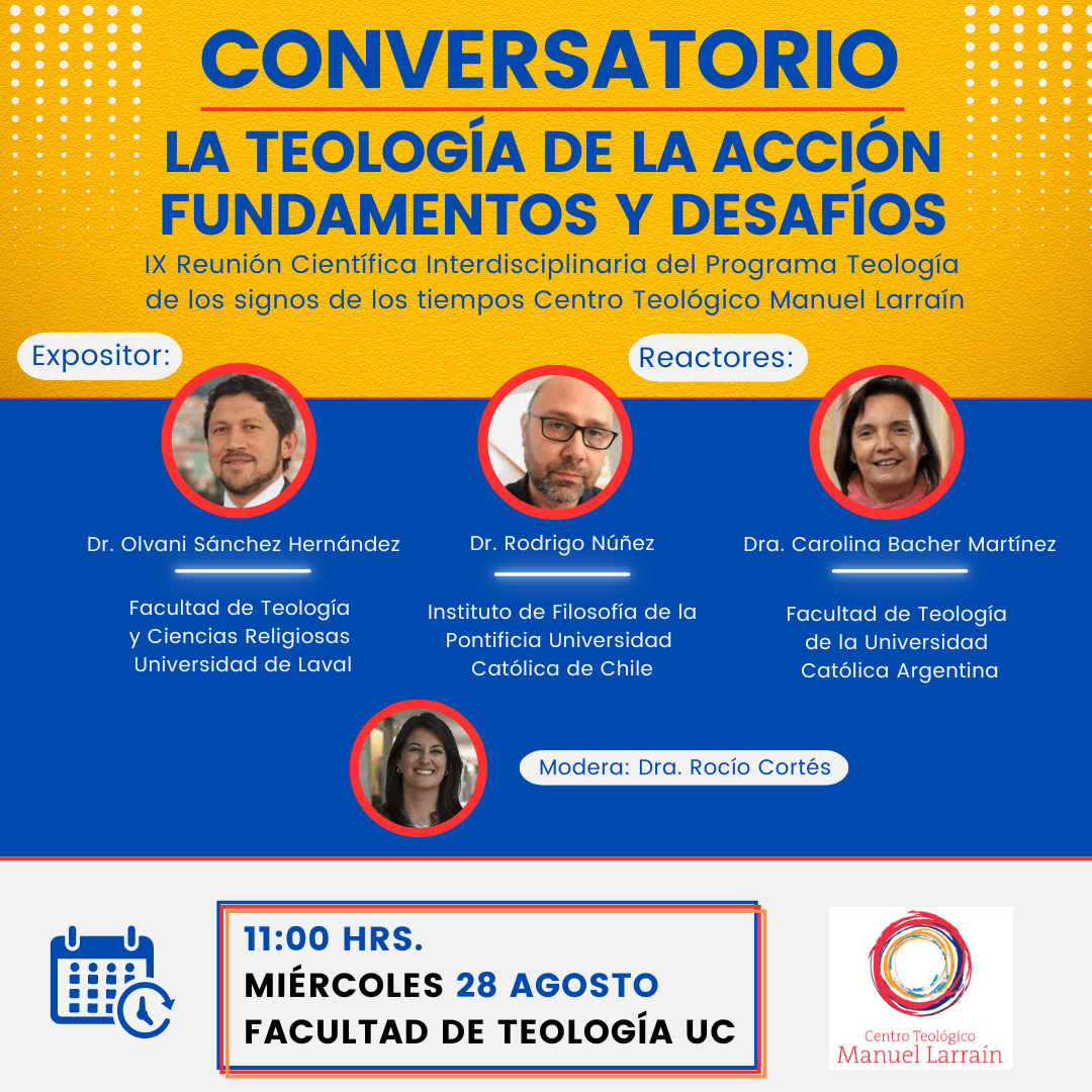 En el marco de la IX Reunión Científica Interdisciplinaria del Programa Teología de los signos de los tiempos del Centro Teológico Manuel Larraín, se desarrollará este conversatorio cuyo objetivo es presentar la pertinencia de una teología de la acción en el ámbito de la teología práctica y problematizar el asunto en un diálogo interdisciplinario entre filosofía y teología.