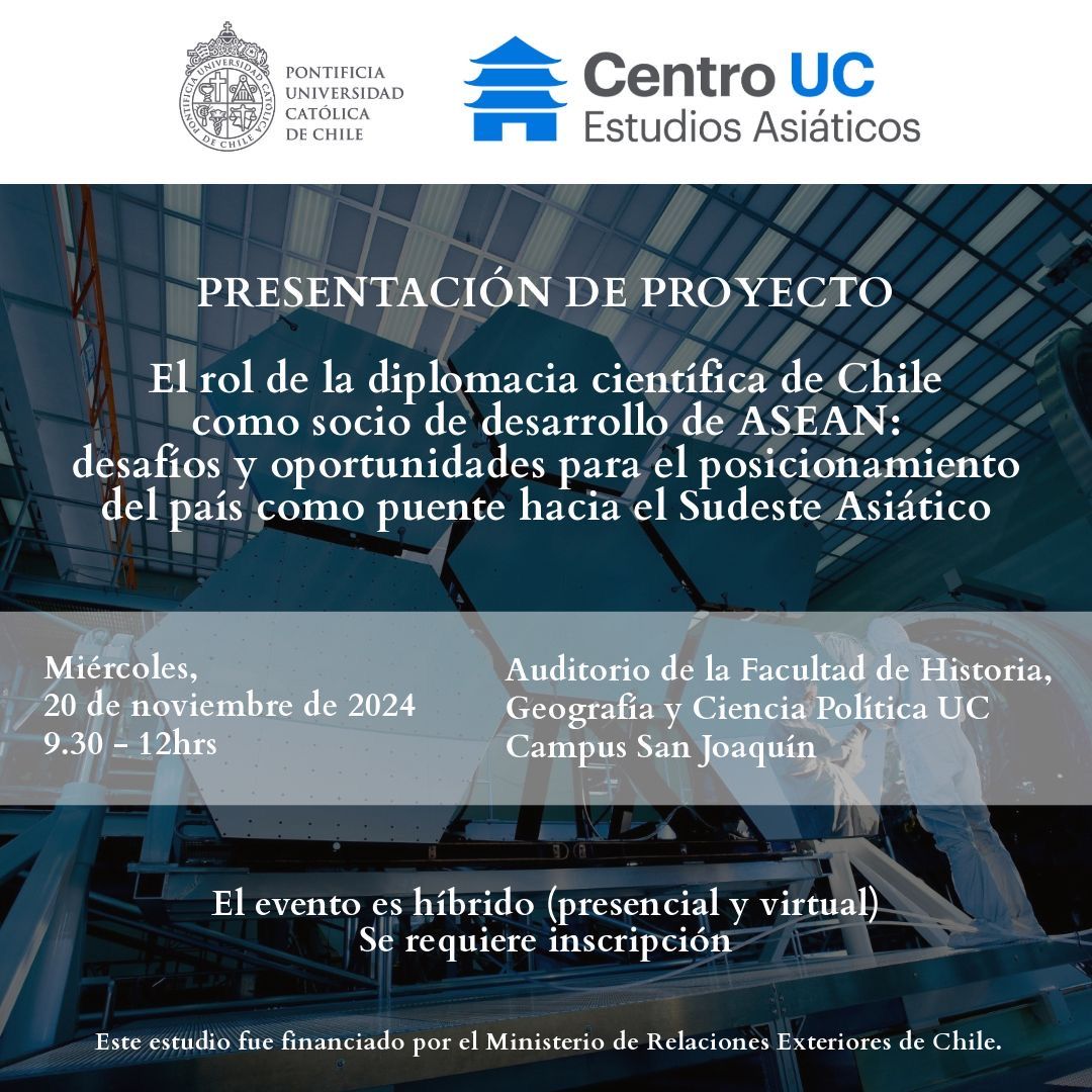 Organizado por el Centro UC de Estudios Asiáticos, este evento presentará los desafíos y oportunidades que enfrenta Chile para posicionarse como un puente hacia el Sudeste Asiático, a través del desarrollo de la diplomacia científica y su rol en ASEAN.