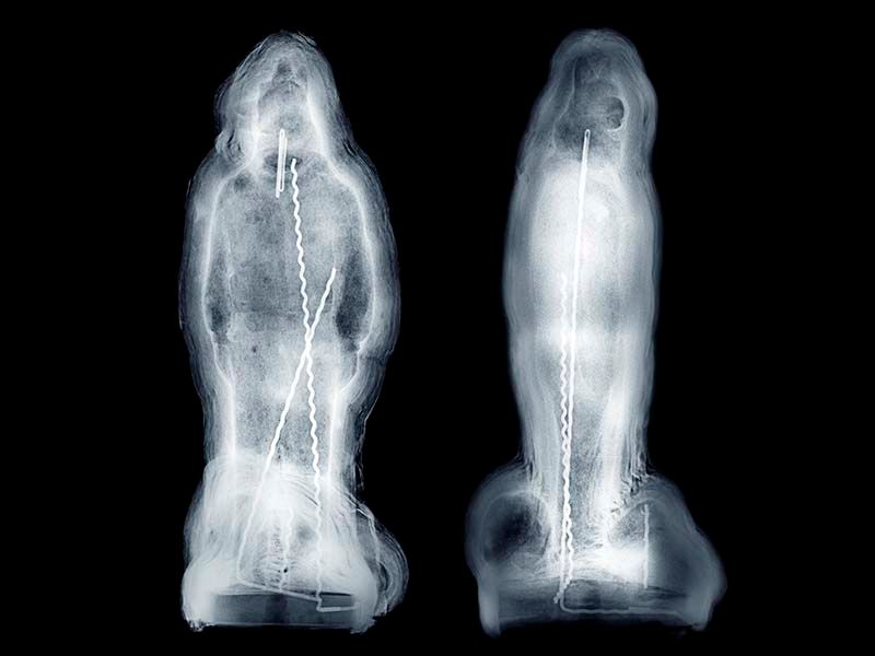 De esta manera, el artista despliega una instalación de gran formato, con 72 piezas escultóricas indescifrables, las cuales se enfrentan a sus análisis por medio de rayos X, haciendo aparecer sutilmente las densidades de los materiales e insinuando imágenes casi fantasmagóricas. Las extrañas figuras que componen «Falso histórico» son analizadas con métodos especializados para su estudio. El uso de prácticas ajenas a lo artístico, viene siendo un sello en el trabajo de Durán que, junto con la ratificación de su naturaleza experimental, plantea un desmontaje de las certezas en la vinculación del arte y las imágenes en general.