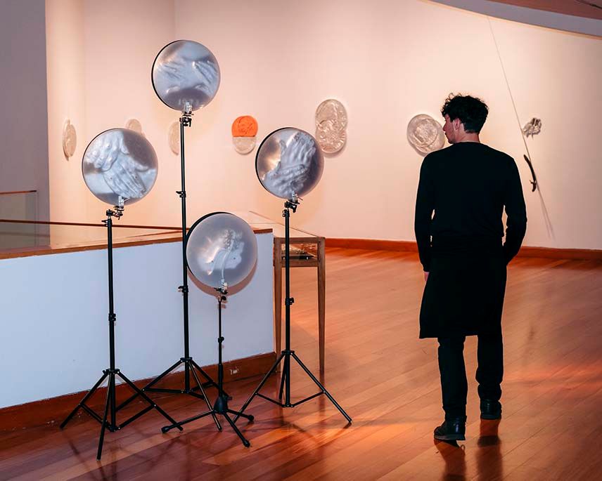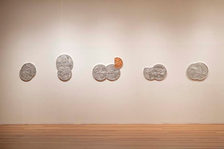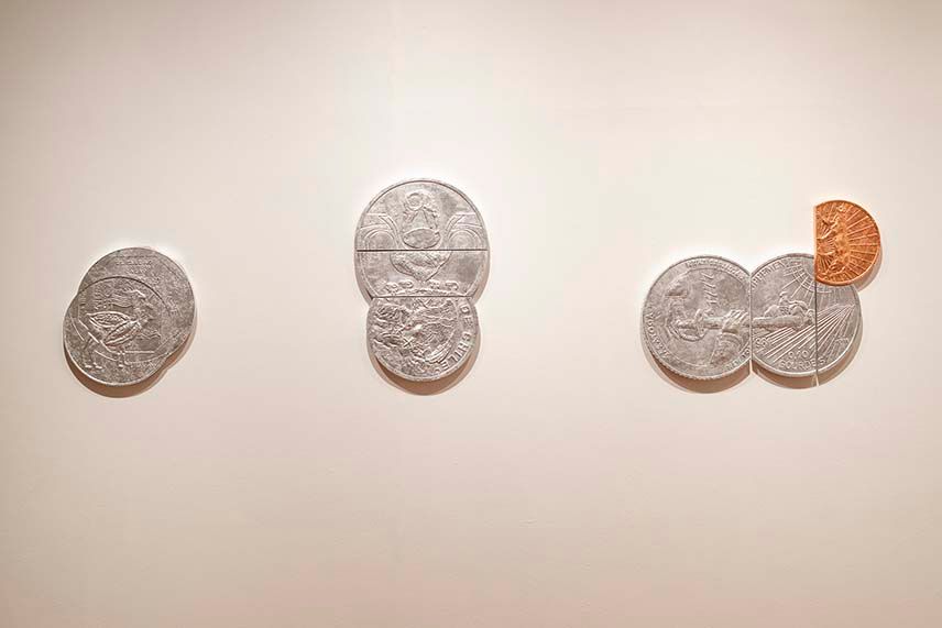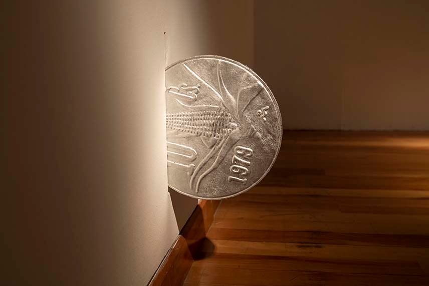 “El título de la exposición PLATA, no sólo alude al dinero en su denominación cotidiana, también al color metálico iridiscente presente en la mayoría de las obras. Aquí profundizo en mi obsesión por la plata, en su versión metálica, centrándome en la superficie reflectante de las monedas y en la peculiar pérdida de su brillo, causado por la oscilación entre manos y bolsillos. El desgaste por uso evidencia al dinero físico, no como signo de poder –posición que actualmente tiene el dinero virtual– sino como señal de valor acotado e incluso de carencia, que puede oírse en loop del tintineo de las monedas que se agitan en las tasas de los desplazados”, comenta el artista Claudio Correa, actualmente radicado en Madrid, España.