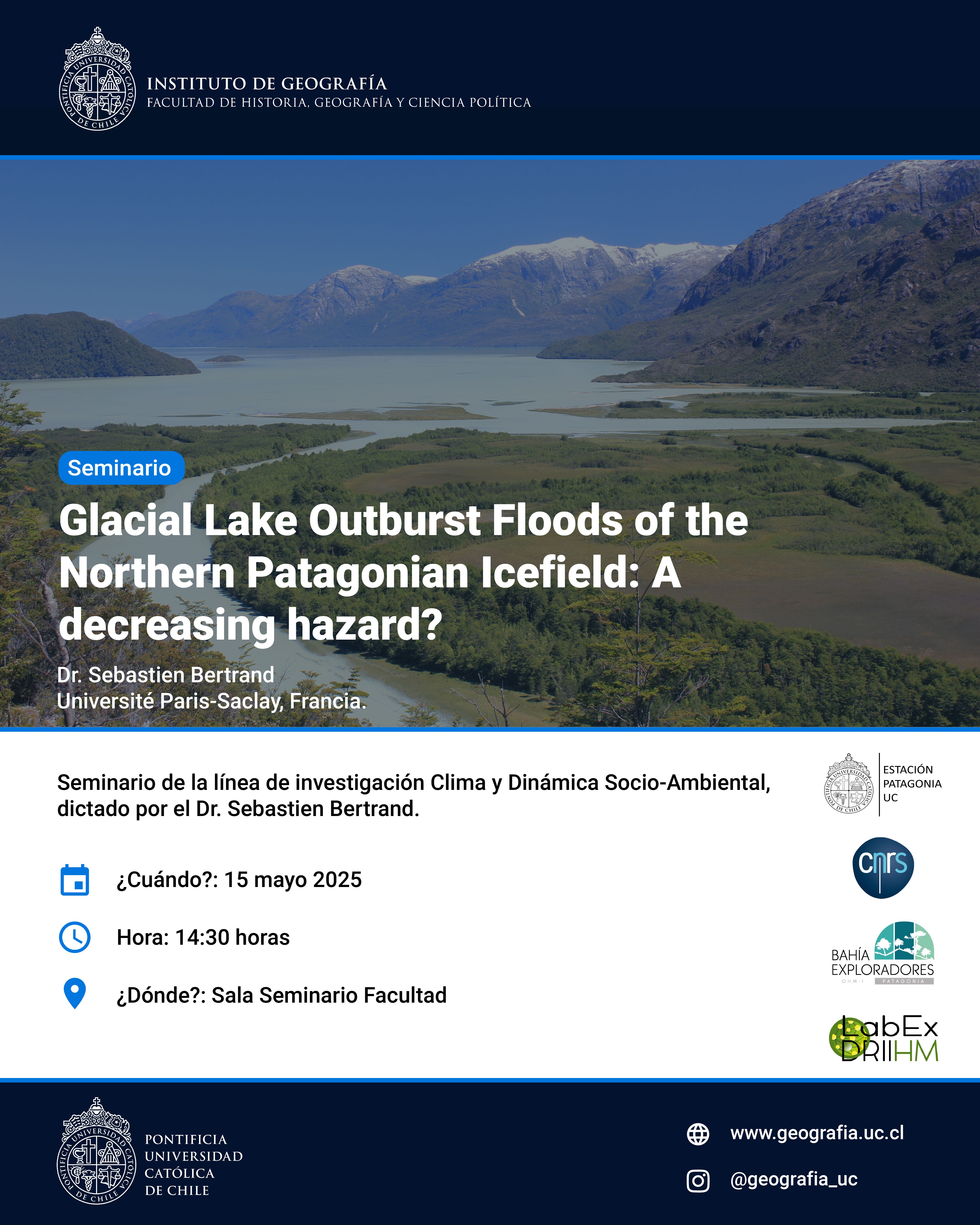 El próximo 15 de mayo de 2025, el Instituto de Geografía UC será sede del seminario “Glacial Lake Outburst Floods of the Northern Patagonian Icefield: A decreasing hazard?”, dictado por el Dr. Sebastien Bertrand, investigador de la Université Paris-Saclay, Francia.