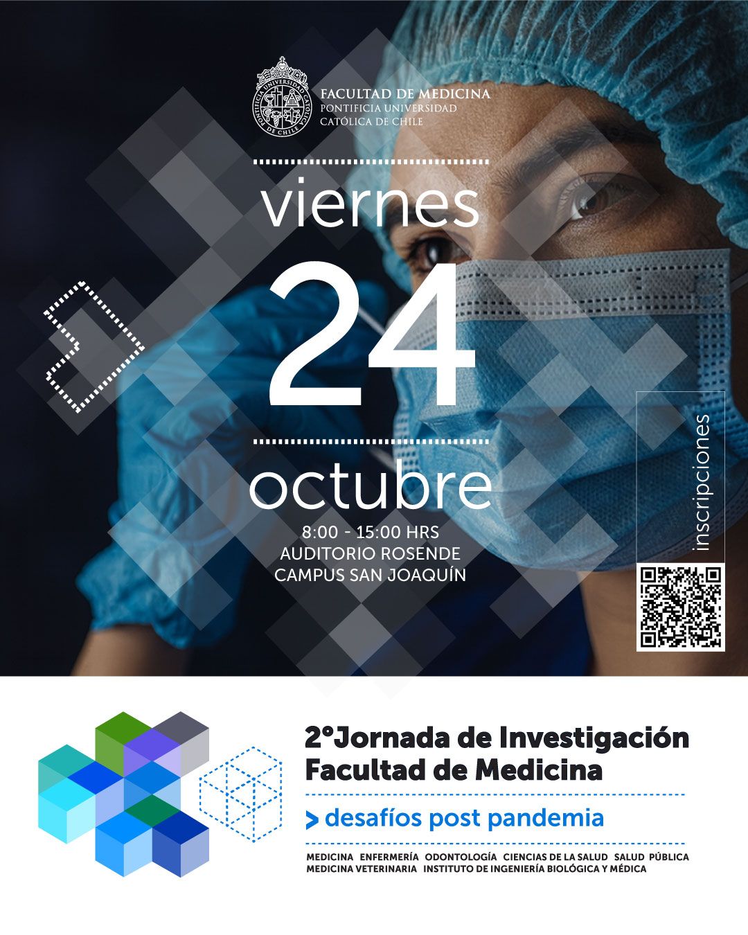 Te invitamos a participar de la II Jornada de Investigación de la Facultad de Medicina UC: Desafíos post pandemia. Una instancia que une la mirada de investigadores e investigadoras de las Escuelas de Medicina, Enfermería, Odontología, Ciencias de la Salud, Salud Pública, Medicina Veterinaria y el Instituto de Ingeniería Biológica y Médica UC.