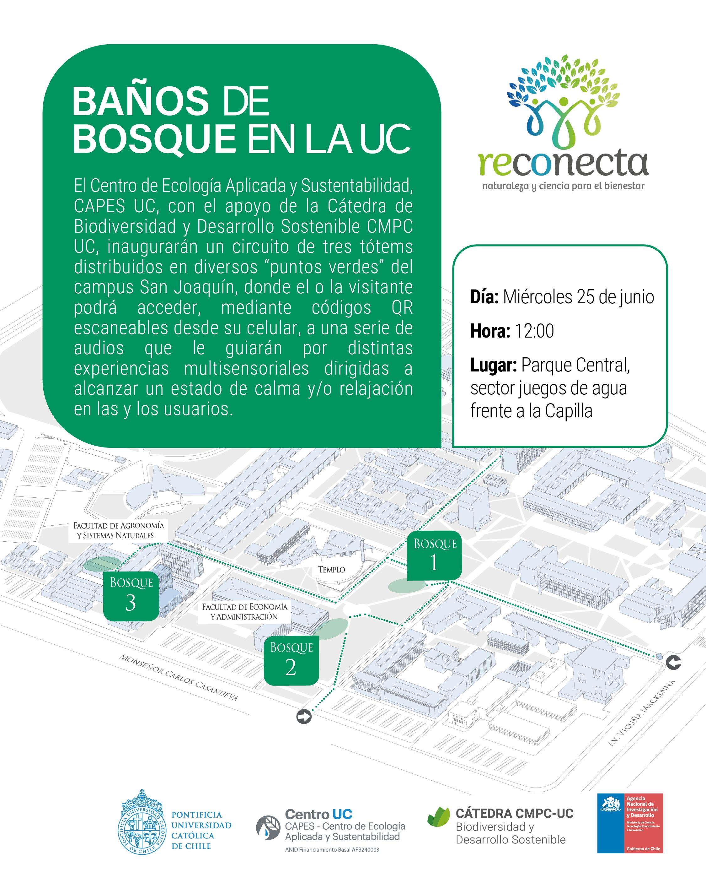 Este miércoles 25 de junio a las 12:00 hrs. en el parque ubicado frente al Templo Sagrado Corazón de Campus San Joaquín (Av. Vicuña Mackenna 4860, Macul), se realizará la actividad de inauguración del proyecto “Baños de bosque en Campus San Joaquín”, una iniciativa inédita que busca convertir este emblemático campus de la Pontificia Universidad Católica de Chile, en la primera sede universitaria de América Latina que albergue en sus límites un circuito gratuito para prácticas autoguiadas de Shinrin Yoku o Baños de Bosque, dirigidas a estudiantes, funcionarias/os, académicas/os y visitantes del campus.