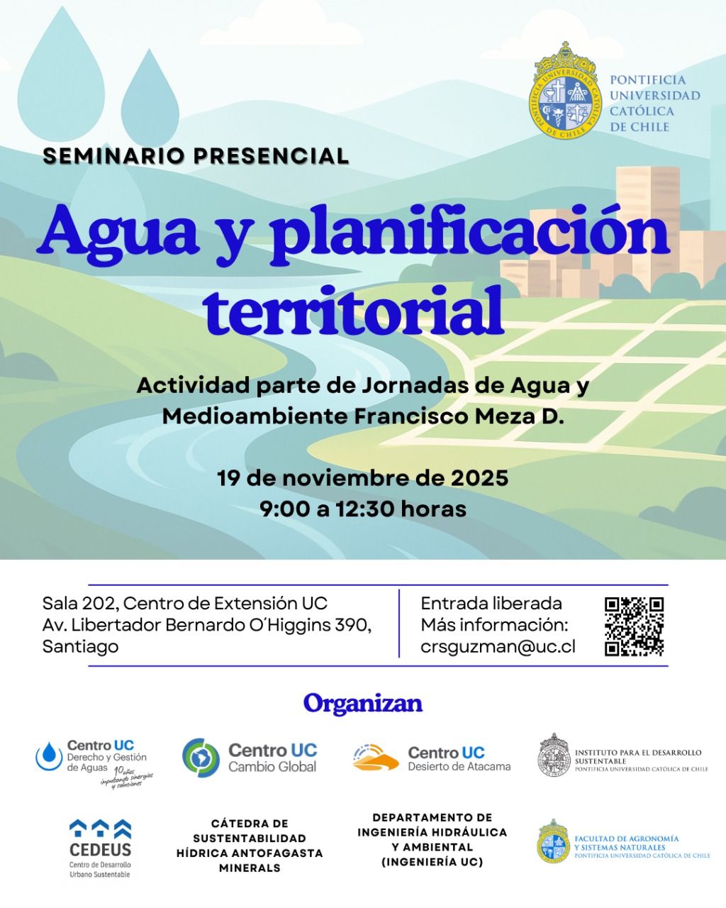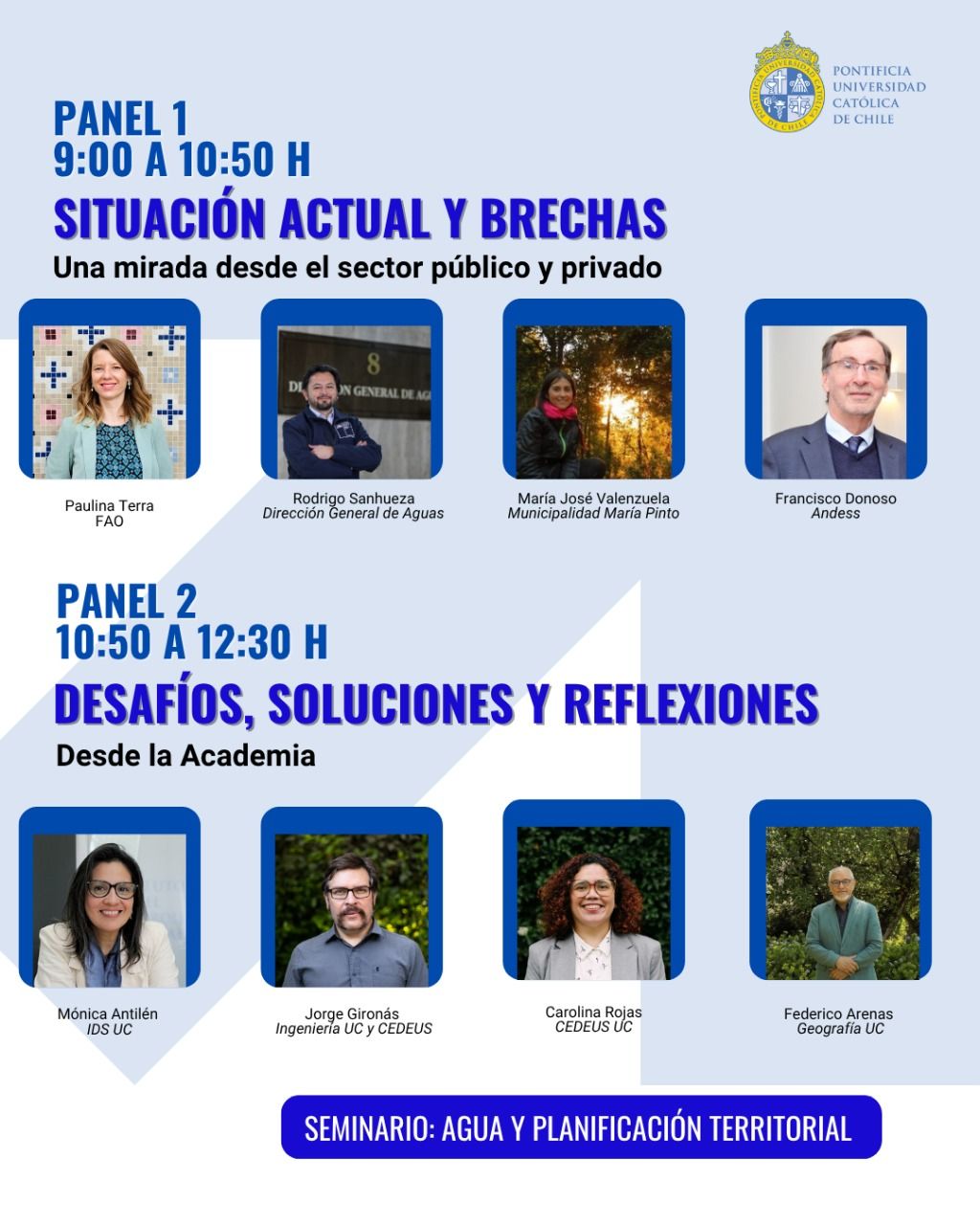 - Jornada AM (9:00 a 12:30 horas): Seminario “Agua y Planificación Territorial”, abierto a la comunidad. En la actividad habrá panelistas del ámbito público, privado y academia.