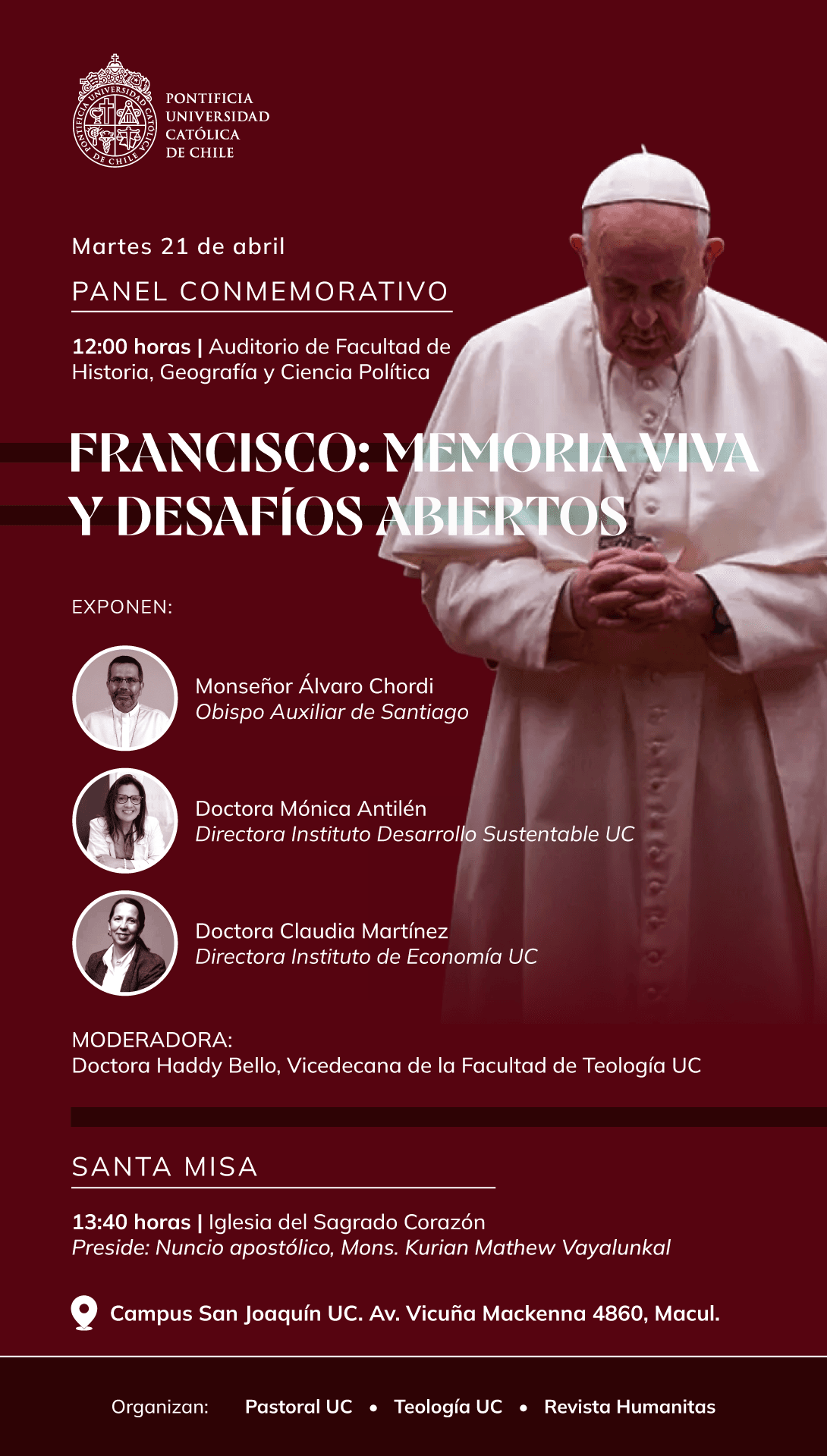 La actividad se realizará el lunes 21 de abril, a las 12:00 horas, en el Auditorio de la Facultad de Historia, Geografía y Ciencia Política, Campus San Joaquín UC. Posteriormente, a las 13:40 horas, se celebrará una Santa Misa en la Iglesia del Sagrado Corazón, abierta a toda la comunidad universitaria.