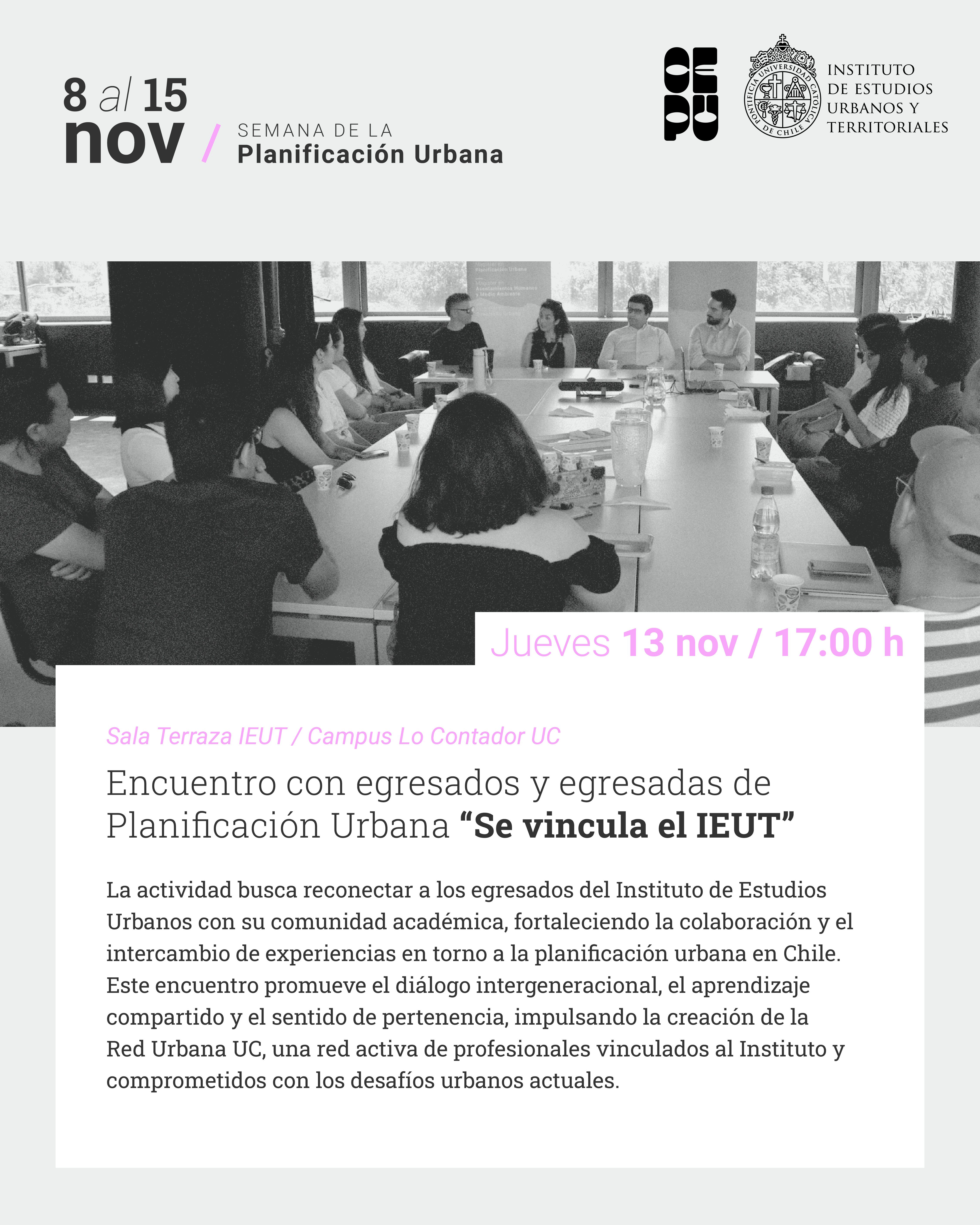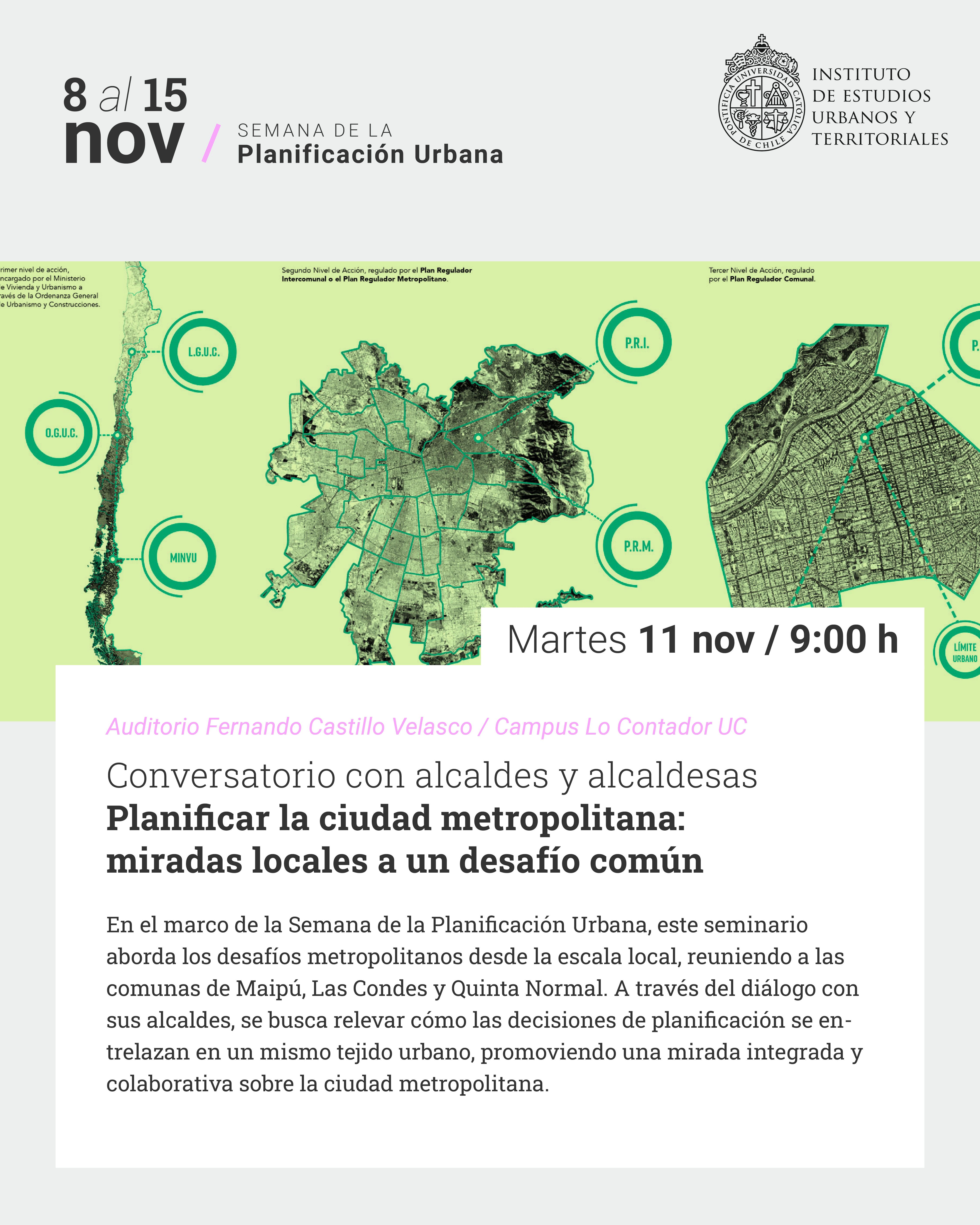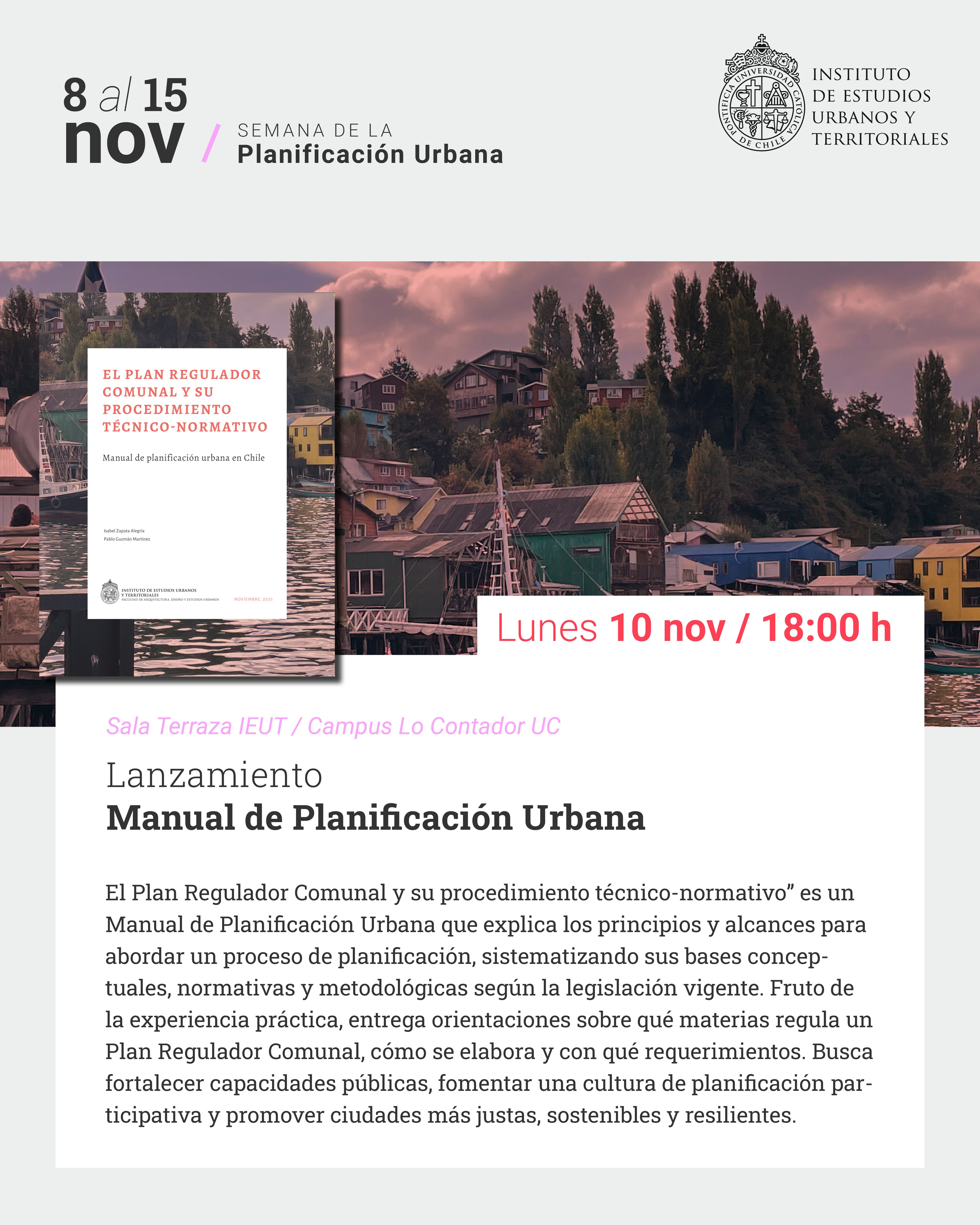 Entre el 8 y el 15 de noviembre, El Instituto de Estudios Urbanos y Territoriales junto a la Facultad de Arquitectura, Diseño y Estudios Urbanos UC, celebran la Semana de la Planificación Urbana 2025, en el marco del Día Mundial del Urbanismo. Este espacio convoca a toda la comunidad académica, profesional e institucional para reflexionar sobre el presente y futuro de nuestras ciudades y territorios.