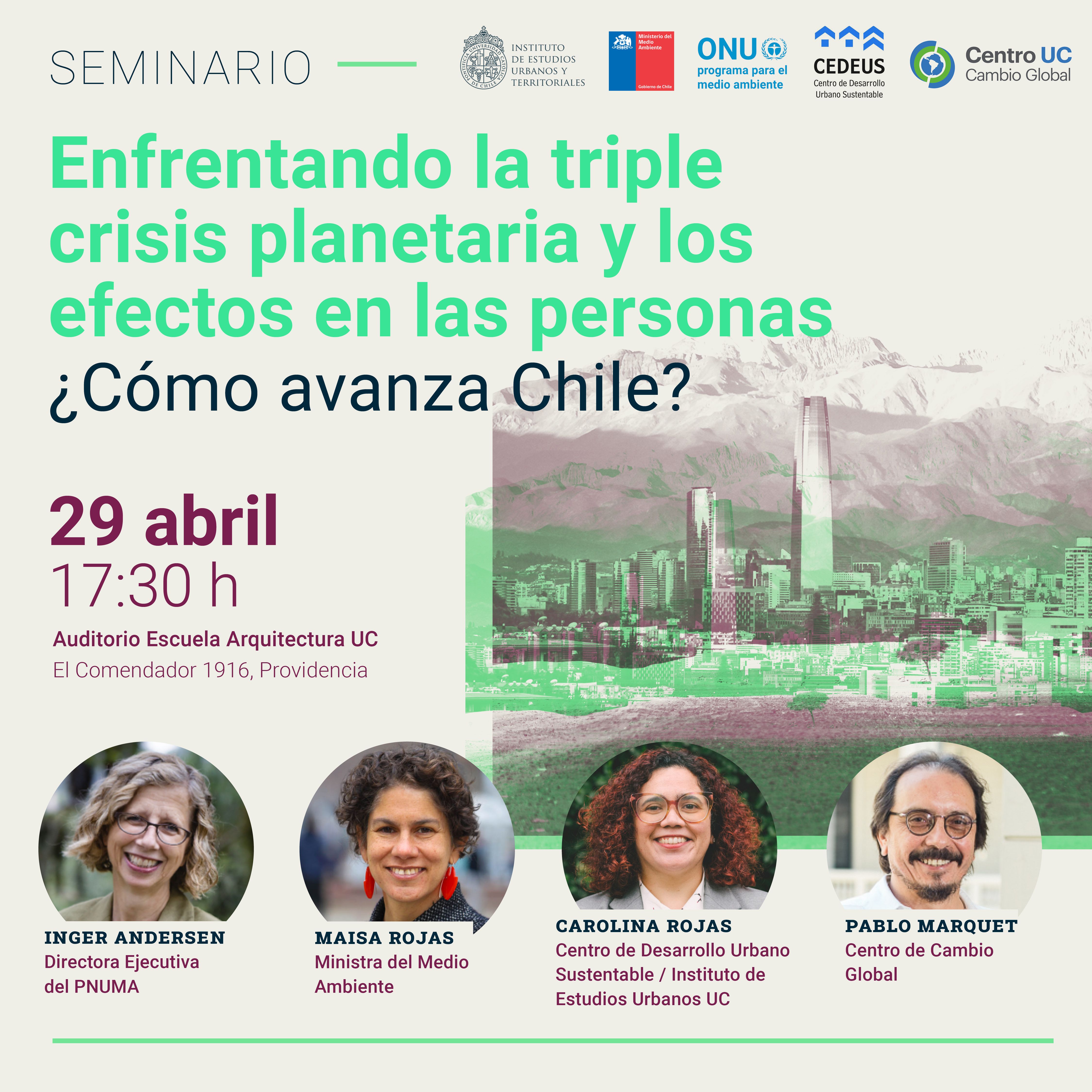 Los y las invitamos al Seminario «Enfrentando la triple crisis planetaria y los efectos en las personas ¿Cómo avanza Chile?» a realizarse el lunes 29 de abril a las 17:30 h en el Campus Lo Contador UC.