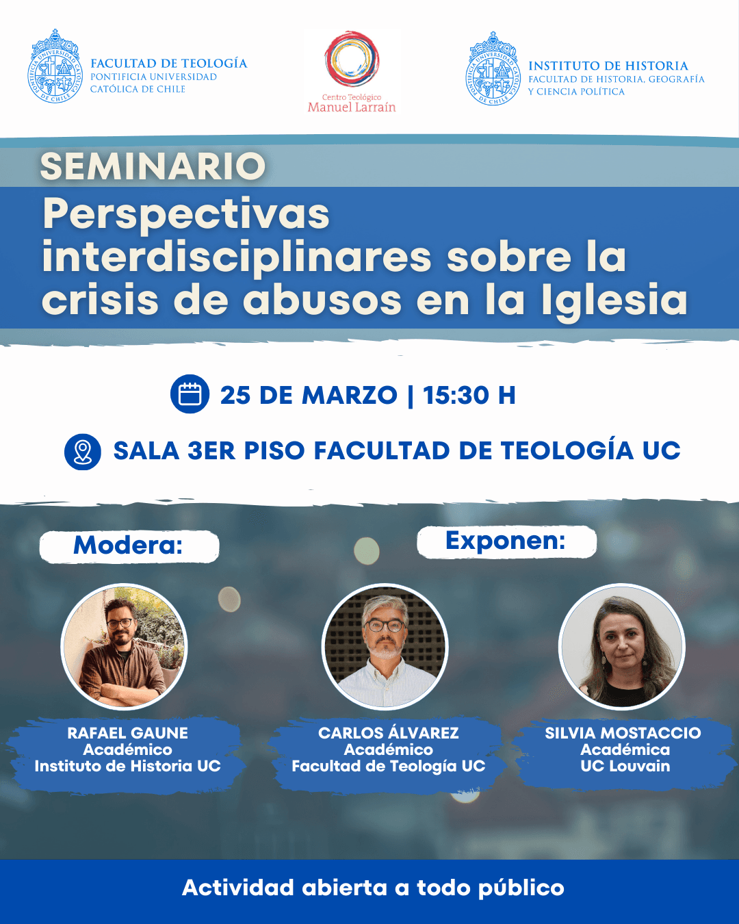 Esta actividad reúne a un grupo de investigadores que, desde una mirada interdisciplinar, buscan profundizar en la comprensión de la crisis de abuso de poder y abuso sexual al interior de la Iglesia Católica. El seminario abordará los aportes recientes de la historia, la teología y las ciencias sociales para comprender este fenómeno en su complejidad y sus desafíos para la institución eclesial hoy.