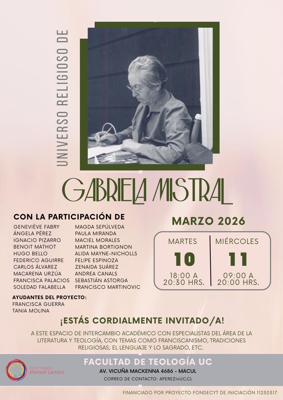 Explora la riqueza espiritual y cultural en los escritos en prosa de Gabriela Mistral en este seminario internacional, financiado por el proyecto Fondecyt “Lectura teológica de los escritos en prosa de Gabriela Mistral: religión, mundo y cultura indoamericana” (Fondecyt iniciación: 11230317), liderado por la académica de Teología UC, Ángela Pérez.