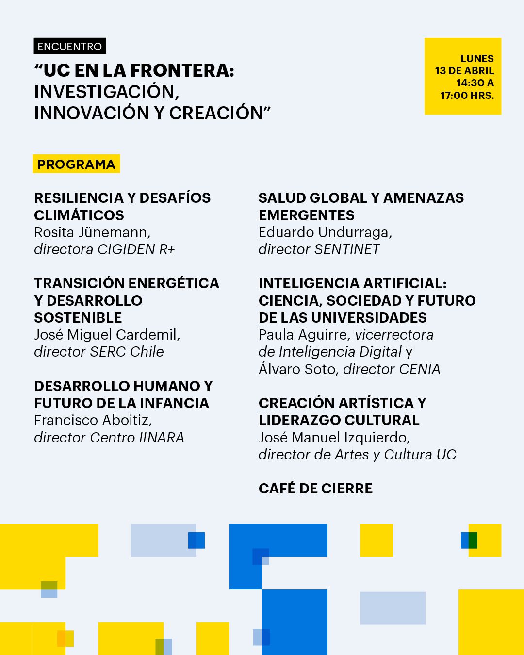 A través de una serie de presentaciones breves, se abordarán temas como resiliencia y cambio climático, transición energética, desarrollo humano, salud global, inteligencia artificial y creación artística, dando cuenta de la amplitud e impacto del quehacer UC en distintos ámbitos del conocimiento.