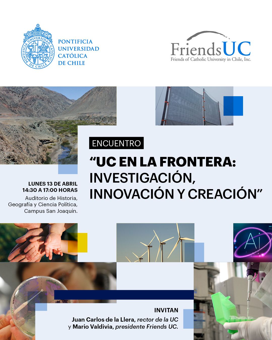 El Rector Juan Carlos de la Llera junto al presidente de Friends UC, Mario Valdivia, invitan a este encuentro que reunirá a destacados académicos de nuestra Universidad para compartir su trabajo y visión en torno a los principales desafíos del presente y del futuro.