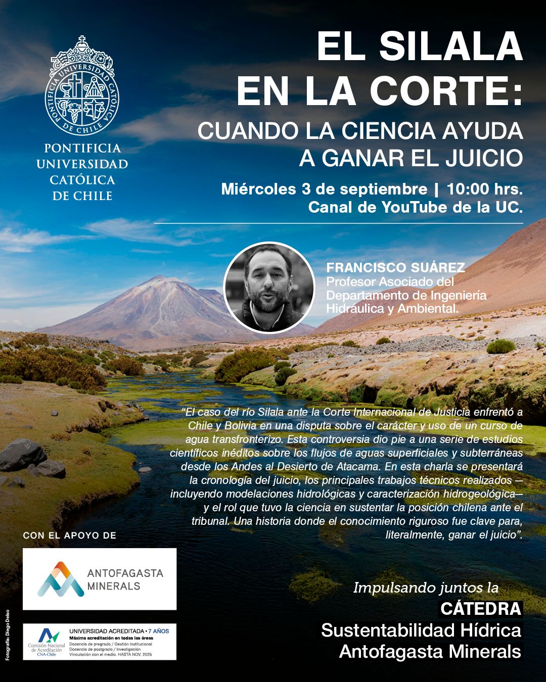 La Cátedra de Sustentabilidad Hídrica Antofagasta Minerals invita a la comunidad UC al webinar "El Silala en la Corte: cuando la ciencia ayuda a ganar el juicio" el próximo miércoles 3 de septiembre a las 10 horas. En la actividad expondrá Francisco Suárez, profesor asociado del Departamento de Ingeniería Hidráulica y Ambiental.