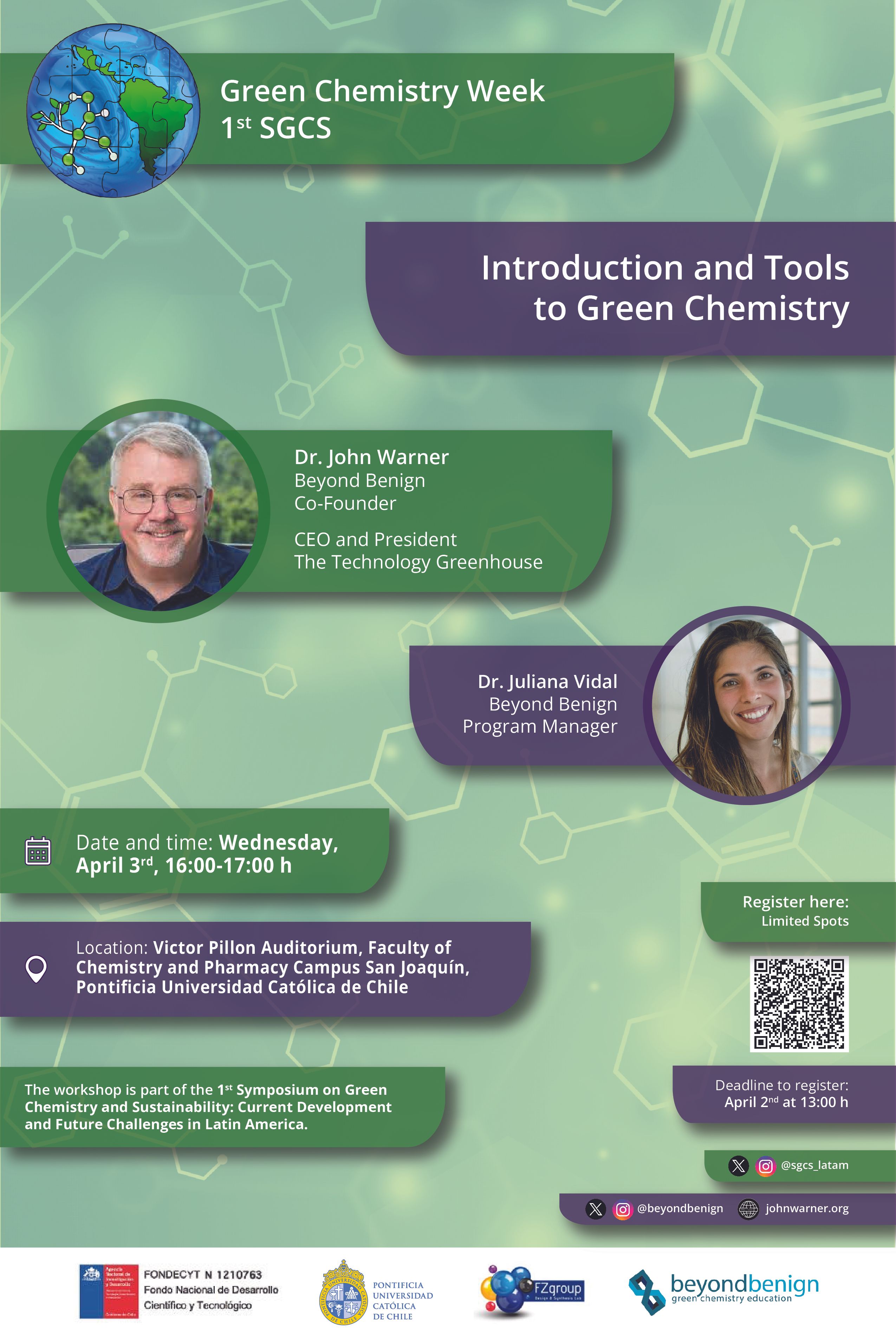 ¡Te invitamos a "Introduction and Tools to Green Chemistry", un workshop en el que expondran el Dr. John Warner, co-founder de Beyond Benign y CEO de The Technology Greenhouse, y la Dra. Juliana Vidal, program manager de Beyond Benign!