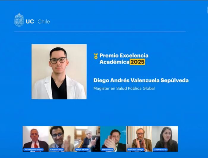 En cada uno de los cuatro programas, se destacó a los estudiantes con el mejor desempeño académico. En ese sentido, se distinguió a Diego Valenzuela Sepúlveda, del Magíster de Salud Pública Global; a Jorge Oporto Caroca, del Magíster en Inversiones y Finanzas Aplicadas; a Luis Aguilar Gutiérrez, Magíster en Ciencia de Datos, y finalmente, a Edilberto Contreras Sierra, del Magíster en Analítica para los Negocios.