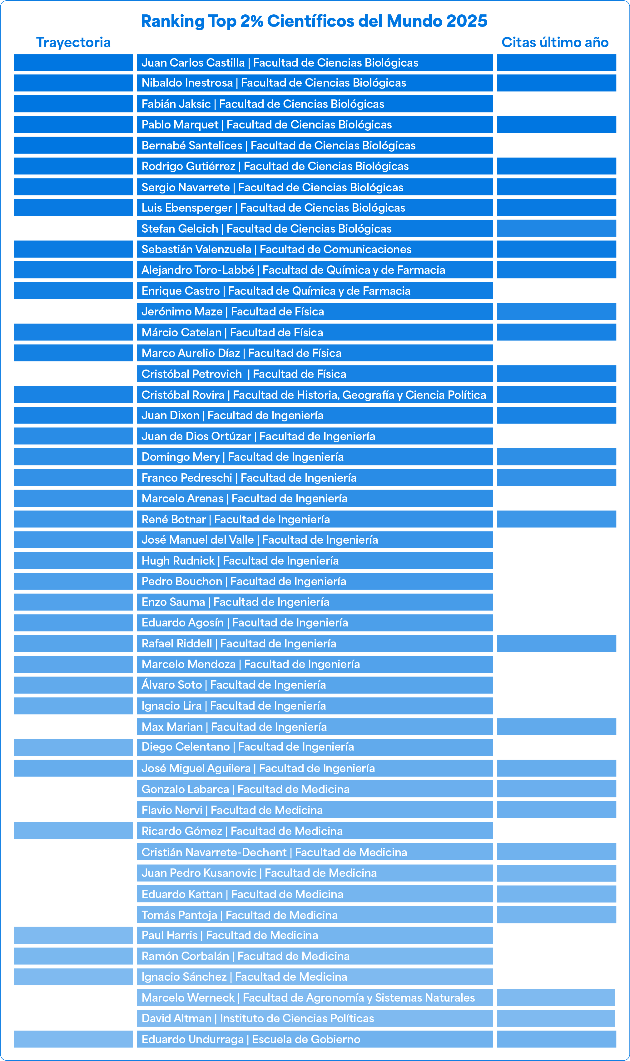 En la siguiente tabla se presentan los académicos UC incluidos en el ranking, organizados según las dos categorías consideradas: trayectoria e impacto de citas en el último año. En total, 30 académicos fueron destacados por su impacto reciente y 36 por su trayectoria, con 18 nombres que aparecen en ambos listados.