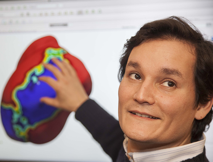 photo_camera Entre los trabajos científicos y tecnológicos de Daniel Hurtado, destaca el primer modelamiento matemático de un corazón virtual en Chile, para entender mejor el funcionamiento de este órgano y las enfermedades cardiovasculares, que es una de las principales causas de muerte en el país.