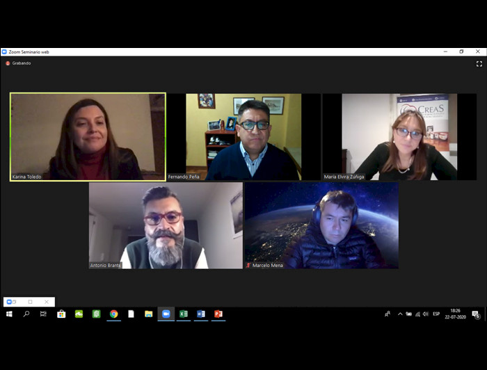 La moderación del seminario estuvo a cargo de Karina Toledo, directora general de Vinculación con el Medio de la PUCV y contó con los panelistas Marcelo Mena, académico de la Escuela de Ingeniería Bioquímica de la PUCV y director del Centro de Acción Climática de esta casa de estudios; María Elvira Zúñiga, académica de la Escuela de Ingeniería Bioquímica de la PUCV y directora del Centro Regional de Estudios en Alimentos Saludables; Fernando Peña, académico del Departamento de Ciencias Ambientales de la Universidad Católica de Temuco, y director del Laboratorio de Plantificación Territorial de la misma casa de estudios y Antonio Brante, director del Centro de Investigación en Biodiversidad y Ambientes Sustentables de la UCSC.