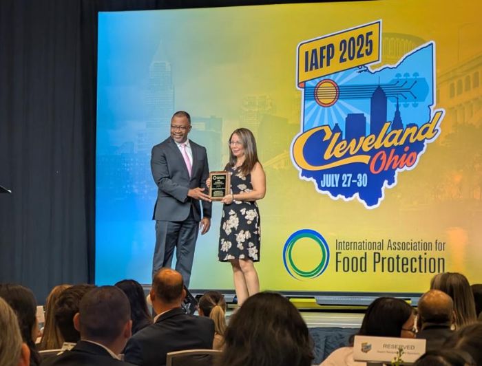 Andrea Moreno recibiendo el International Leadership Award en el encuentro anual de la Asociación Internacional para la Protección de los Alimentos en Cleveland, EE.UU.