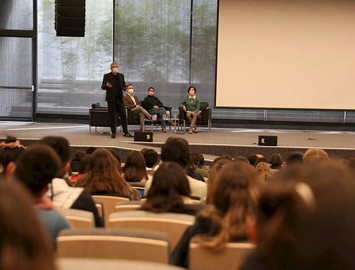 La instancia reunió a cerca de 300 personas en el auditorio Francisco Rosende de Economía, entre estudiantes del curso de Sustentabilidad (SUS1000) de pregrado, académicos, funcionarios y miembros de la comunidad UC.