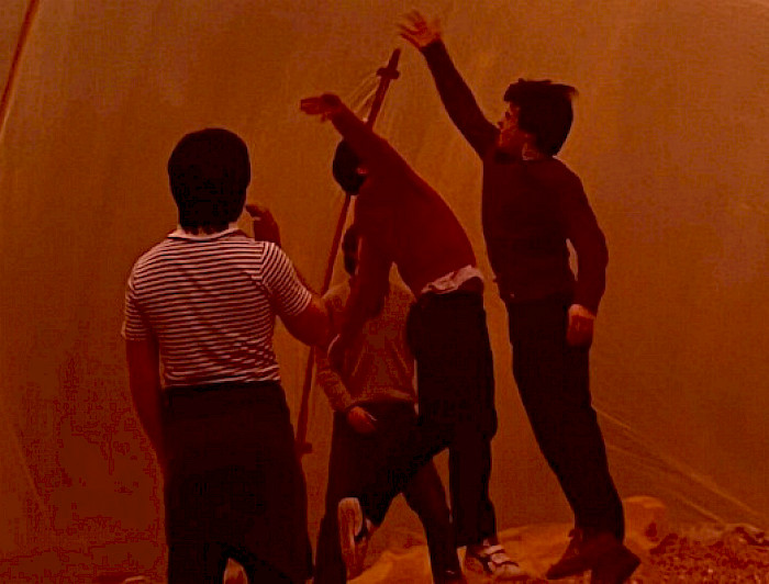 photo_camera Fotografía de “El año cero”, intervención realizada por estudiantes del Taller IV liderado por Montserrat Palmer en 1984, con motivo de los 90 años de la Escuela de Arquitectura UC. Cortesía de Luis Eduardo Bresciani L.