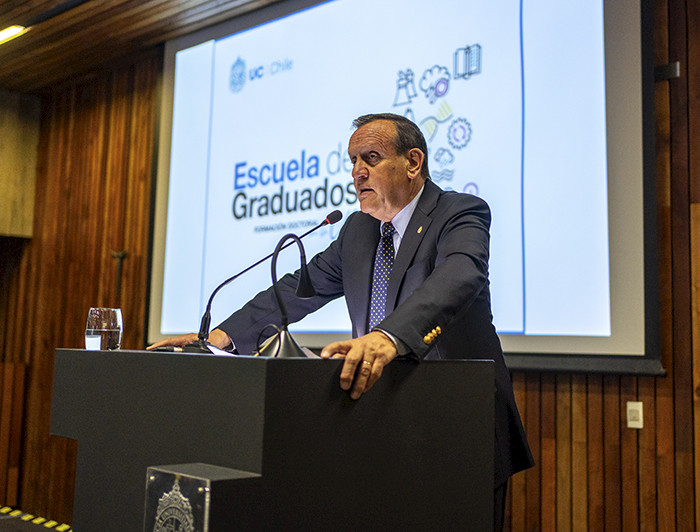 Durante la ceremonia, Pedro Bouchon, vicerrector de Investigación de la UC, dirigió unas inspiradoras palabras para los futuros doctores y doctoras. Más tarde, en el break de la jornada, señaló que las y los estudiantes podrán aprovechar el ecosistema de investigación que la universidad les brinda, como los centros ANID, centros UC y la Red de Centros y Estaciones Regionales, a lo largo del territorio de Chile, para realizar trabajo de campo y trabajar con las comunidades, si sus tesis así lo requieren.