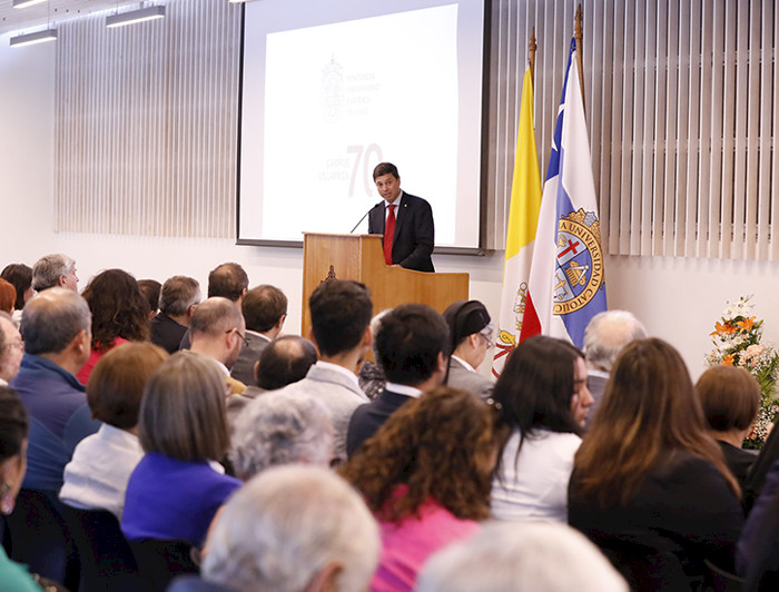 El rector Ignacio Sánchez comenzó agradeciendo a todas las personas que han apoyado este proyecto educativo durante estos años, y a toda la comunidad del campus, quienes entregan todo su aporte diariamente al desarrollo de este. Además, destacó la figura del padre Paul Wevering y de las Hermanas Maestras de la Santa Cruz, una parte importante de lo que es hoy la universidad en Villarrica se debe a su trabajo pionero.