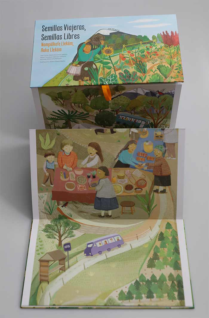 Con atractivas ilustraciones y en un formato desplegable, estilo acordéon, el libro “Semillas viajeras, semillas libres” atrae miradas y despierta la curiosidad. El documento está contado en primera persona por una semilla de poroto pallar que viaja en una bolsita y recorre largas distancias.