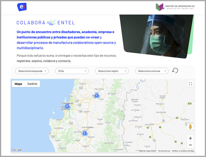 En una alianza entre Entel y el Centro de Innovación UC nace “Colabora Entel”, una plataforma que busca ser un punto de encuentro entre el ecosistema de fabricación digital con la sociedad. Esto, con el fin de conectar con quienes requieren elementos de protección personal (EPP), insumos claves en medio de esta emergencia sanitaria, producto del covid-19.