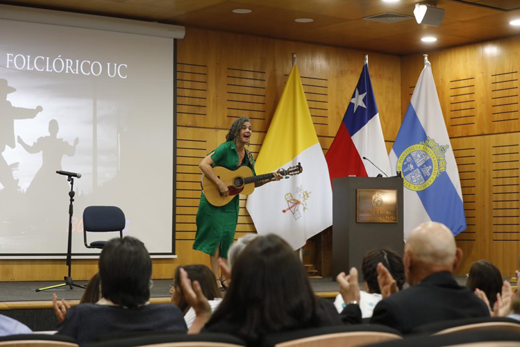 Solo con su voz y su guitarra, Natalia Contesse, cantautora chilena, llenó el auditorio de Historia, Geografía y Ciencia Política en el campus San Joaquín, interpretando canciones de su último disco "Autobiografía en Cueca". Así se celebraron los 30 años del Conjunto Folclórico UC, grupo integrado por 23 funcionarios de diferentes áreas de la Universidad.