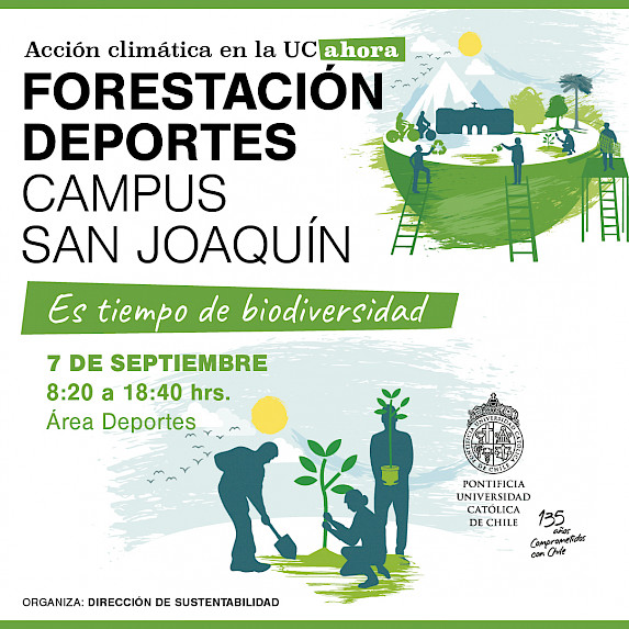 Con el objetivo de proporcionar servicios ecosistémicos y generar un espacio biodiverso para la vida de árboles, arbustos, aves e insectos; así como también embellecer el campus e impulsar la participación de la comunidad en una actividad en contacto directo con la naturaleza, se llevará a cabo una nueva forestación en el área de Deportes en el campus San Joaquín de la Pontificia Universidad Católica de Chile.