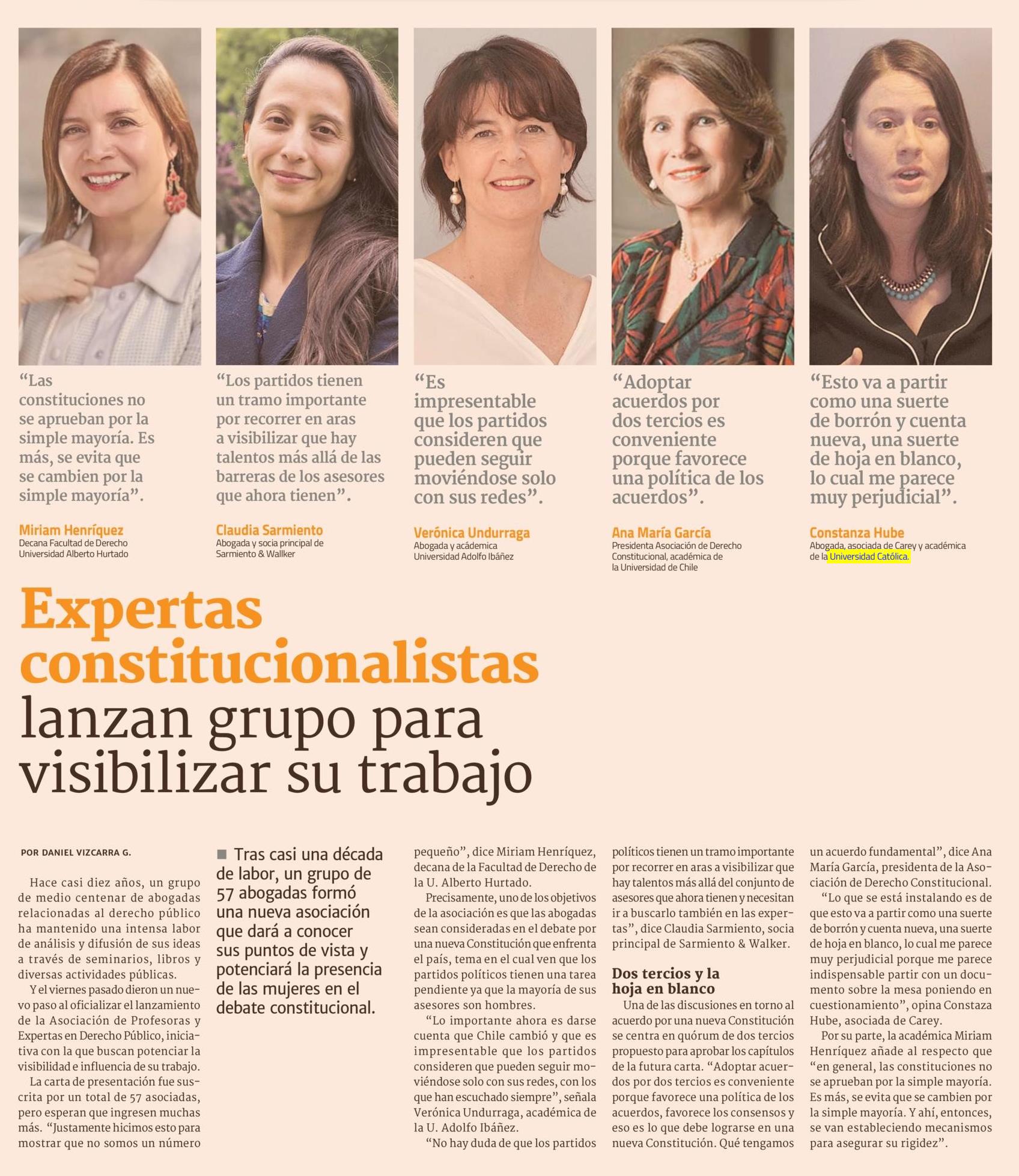 Este 15 de noviembre, a través de diversos medios, se informó sobre la existencia de la Asociación de Profesoras y Expertas en Derecho Público. En declaración suscrita por 57 académicas de distintas instituciones del país, se constata que cuatro de quienes la firman -Constanza Hube, Alejandra Ovalle, Sandra Ponce de León y Cecilia Rosales- son académicas de la Facultad de Derecho UC. Mediante tal declaración, dicha agrupación adhirió el Acuerdo por la Paz Social y la Nueva Constitución que nos desafía como país a pensar en una nueva Carta Fundamental.