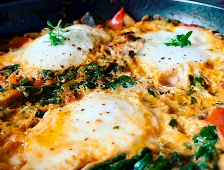 Suma las espinacas y revuelve por un minuto. Añade un poco de agua extra. Crea pequeños agujeros en la salsa con una cuchara de palo y rompe los huevos en los agujeros. Intenta ser cuidadoso y mantén las yemas enteras.