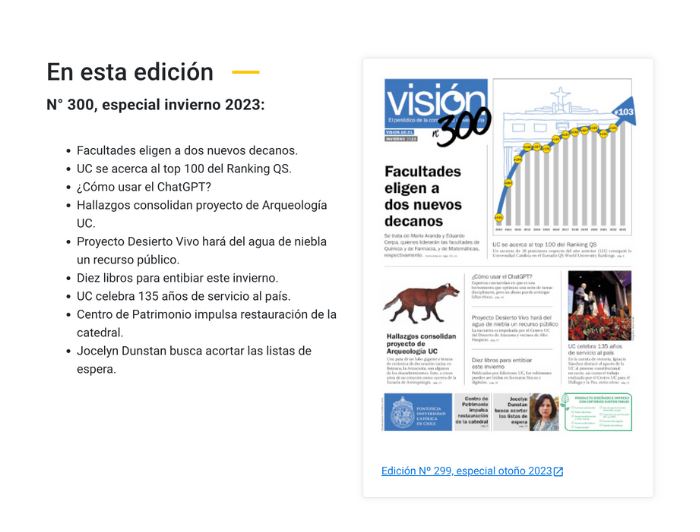 En otros artículos, destaca el reportaje sobre cómo aprovechar (sin abusar) las ventajas del Chat GPT, sitio en torno al cual no solo el Ministerio de Educación ha publicado una guía docente para su uso, sino también el Centro de Desarrollo Docente, la Dirección Académica de Docencia y Bibliotecas UC: dichas unidades desarrollaron en conjunto un sitio con muchísimo material y lineamientos para el uso de herramientas de Inteligencia Artificial como el ChatGPT en la UC (ver aquí).
