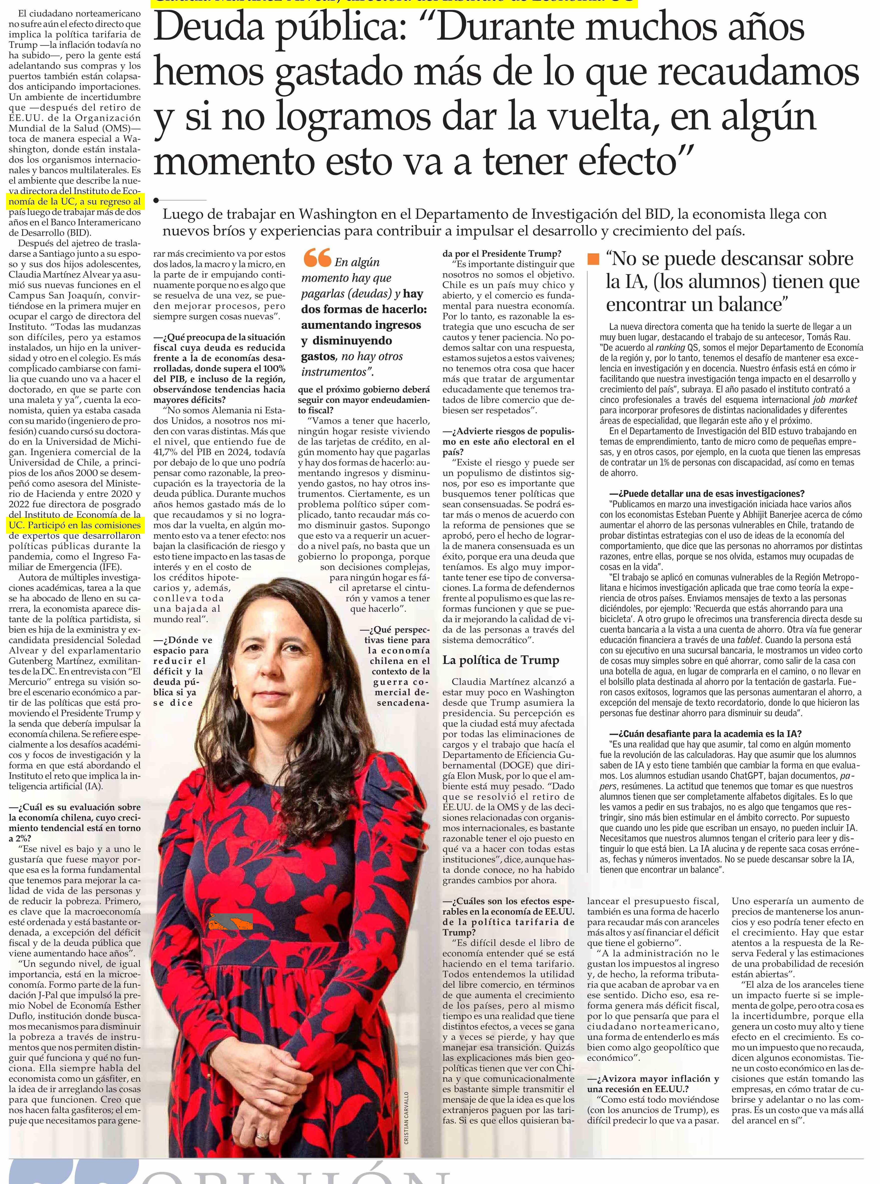 Claudia Martínez no es ajena a los desafíos. Desde que asumió su nuevo cargo como directora del Instituto de Economía se ha enfrentado a la exigencia de liderar esta unidad académica que, según el ranking QS, es el número 1 de América Latina para estudiar economía.
