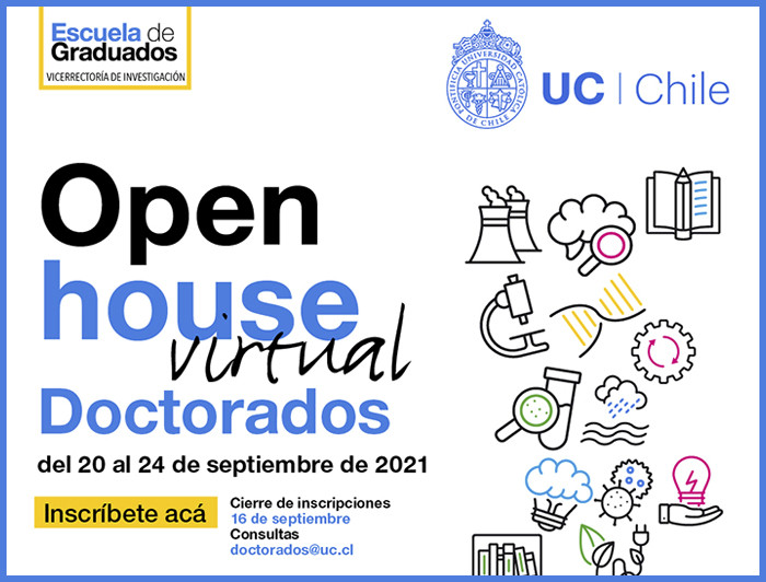 La Escuela de Graduados de la Vicerrectoría de Investigación de la UC realizará el "Open House virtual de Doctorados UC 2021", evento que se realizará entre el 20 y el 24 de septiembre. Será una semana donde los participantes podrán conocer los 39 programas de doctorado de la universidad, quiénes son los académicos y académicas detrás de ellos, cuál es la experiencia de los graduados, además de cuál ha sido el impacto de sus investigaciones en la sociedad global y local.