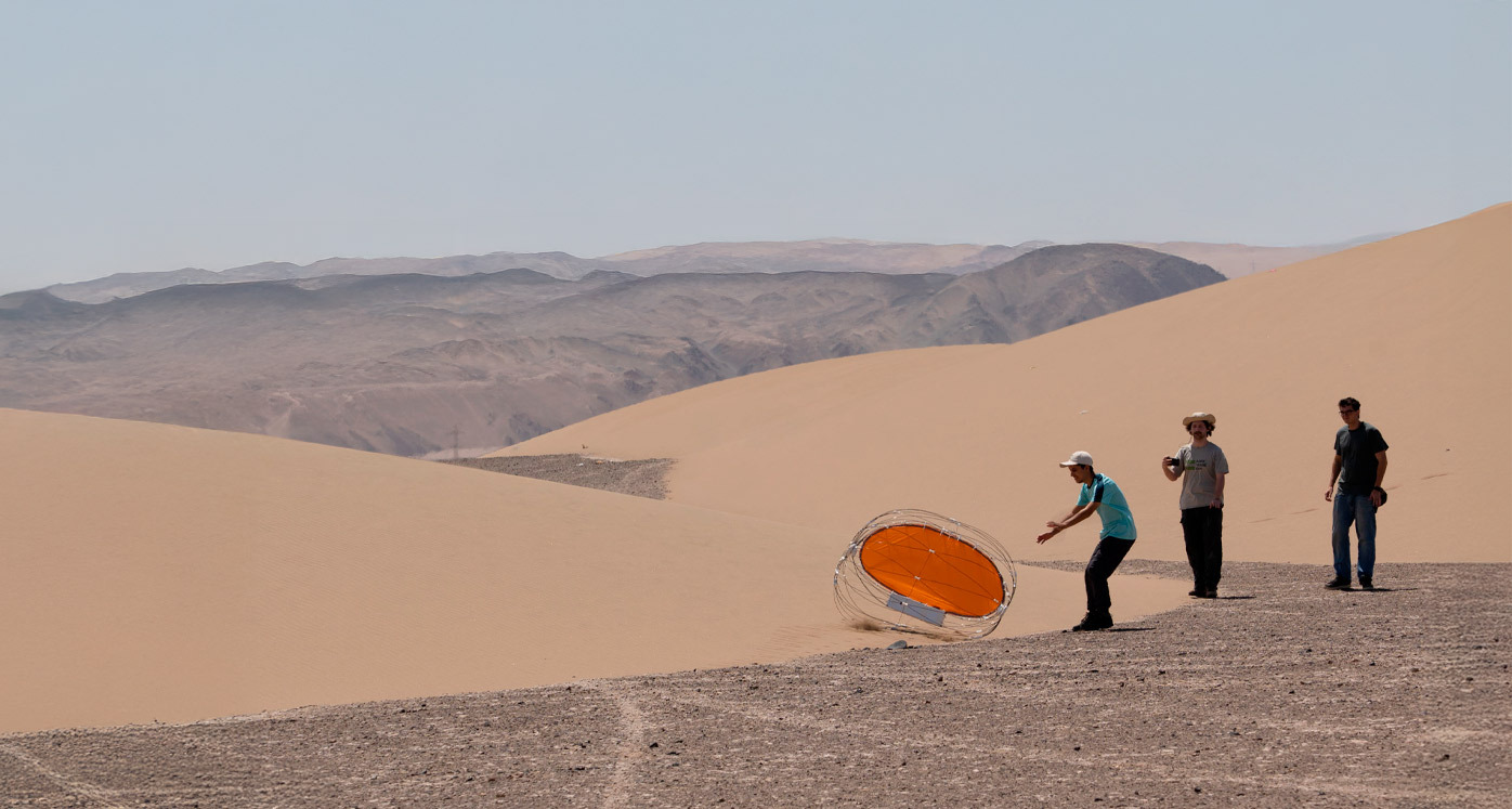 James y Moritz realizan los últimos ajustes del rover. Uno, dos, tres: los investigadores sueltan el prototipo por primera vez y este comienza a rodar propulsado por el viento, primero lentamente y luego toma velocidad, hasta que llega a una de las dunas y se detiene en su ladera. La prueba se repite varias veces, topándose con algunas piedras y moviéndose de forma errática, hasta que se detiene por sí mismo.