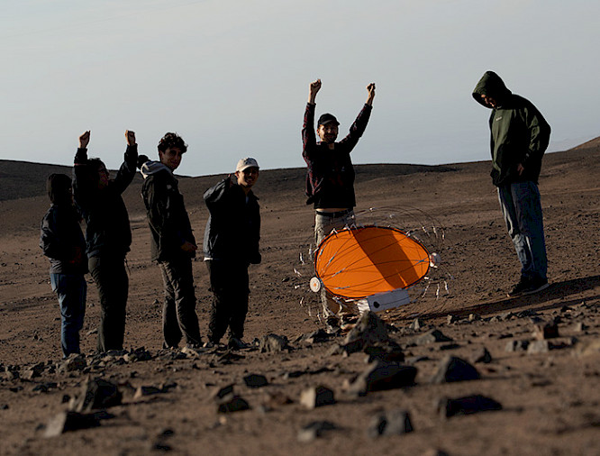 Los científicos sonríen. El rover ha sorteado con éxito el primero de los diez días de pruebas en el desierto. El logro es celebrado por el grupo que los acompaña, conformado por el profesor Pablo Osses, el coordinador regional de la Red de Centros y Estaciones Regionales UC Milton Avilés y cinco estudiantes del Instituto de Astrofísica.