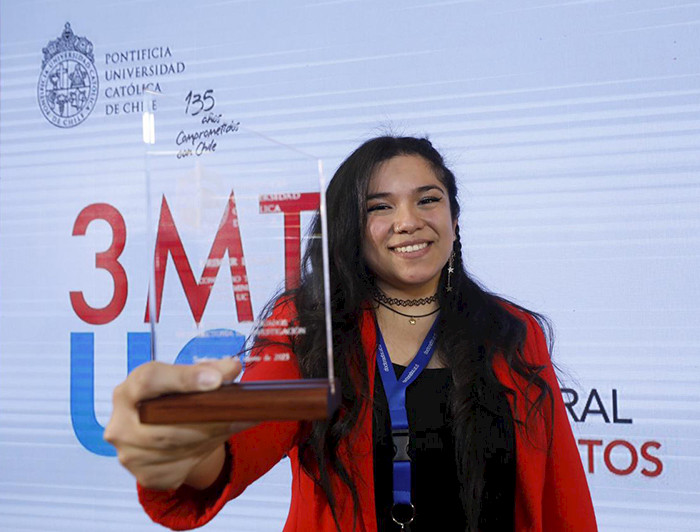 El primer lugar lo obtuvo Macarena Droguett con su tesis titulada “The Universe in a Bowl of Ramen”. “Siento mucha emoción por el primer lugar, no me lo esperaba. Estoy muy contenta de haber transmitido mi tesis. Espero que al público le haya emocionado. Y también orgullosa de haber representado a la Facultad de Física y al Departamento de Astrofísica", afirmó. Macarena tendrá la oportunidad de representar a la Universidad Católica en la versión internacional del concurso Tesis en Tres Minutos (3MT®) de la Red Universitas 21.