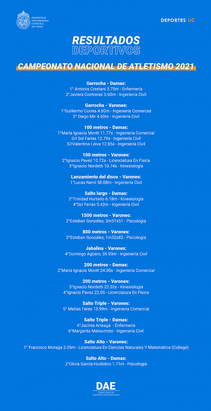 La alumna de Ingeniería Comercial, María Ignacia Montt, marcó un tiempo récord de 11 segundos y 77 centésimas en el Campeonato Nacional de Atletismo 2021. El desempeño de los estudiantes UC permitió conseguir, en total, cinco medallas de oro, seis de plata y cuatro de bronce en distintas disciplinas.