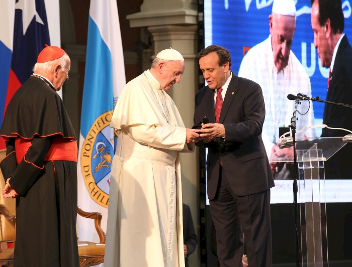 Al visitar los otros recintos de la visita y constatar la alegría que generaba, me dijo: “aquí tenés a todo Chile”, frente a una multitud que le sacaba fotos y lo vitoreaba. Luego hubo un cambio, se acercó a personas de la comunidad que han tenido problemas serios de salud, los bendijo y rezó con ellos. Fueron segundos de recogimiento que parecieron minutos, en esos segundos sólo importaba la persona que sufría y creía en una bendición importante. “Nos subimos al escenario que estaba preparado y saliéndose del protocolo -ya que dos guardias suizos lo ayudarían-, se tomó de mi brazo y me dijo ‘afirmáme, los rectores tienen fuerza…’. Ya preparados para iniciar la ceremonia, vino un aplauso de los asistentes que duró varios minutos, -es bueno repasar el video-, “ahí noté al Sucesor de Pedro emocionado, su rostro cambió y demostró una alegría profunda. Lo mismo me ratificó Monseñor Ezzati, Gran Canciller de la UC, con quien compartíamos el escenario”.