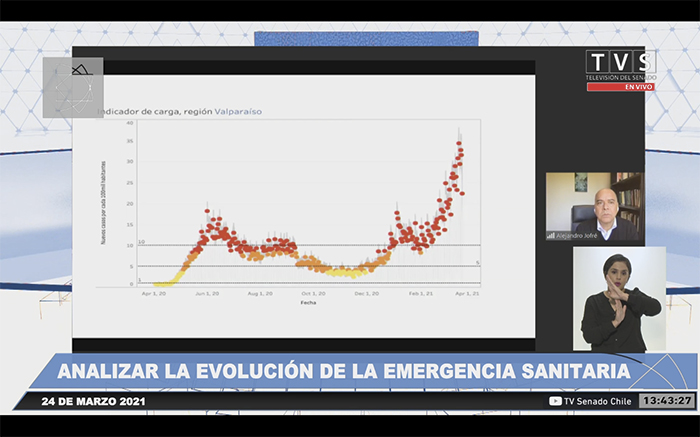 ICOVID Chile, iniciativa lideradas por la Universidad de Chile, la Pontificia Universidad Católica de Chile y la Universidad de Concepción, que cada semana presenta un análisis y datos de diversas dimensiones propuestas para monitorear la pandemia en el país, en un convenio de colaboración con los Ministerios de Salud y de Ciencia, Tecnología, Conocimiento e Innovación, presentó este miércoles 24 de marzo en una sesión especial del Senado de la República sus datos del estado de la crisis sanitaria.