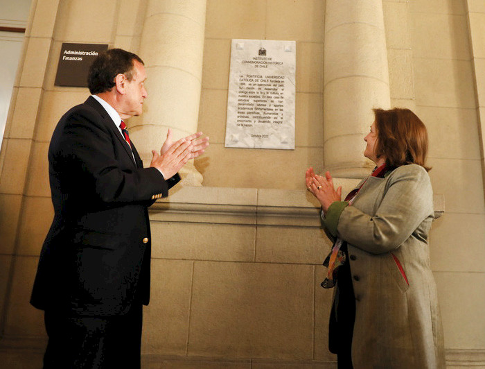 En su discurso, Cecilia García Huidobro, presidenta del Instituto de Conmemoración Histórica de Chile, señaló que “el directorio en sesión solemne decidió por unanimidad instalar una placa a la Pontificia Universidad Católica de Chile, por constituir un patrimonio de la Nación que ha establecido un diálogo entre la cultura y la fe y que ha aportado de manera fundamental e integral en las áreas científicas, humanistas y artísticas. En los nobles muros del palacio universitario dejamos esta placa que en un humilde gesto sintetiza la grandeza de la universidad”.