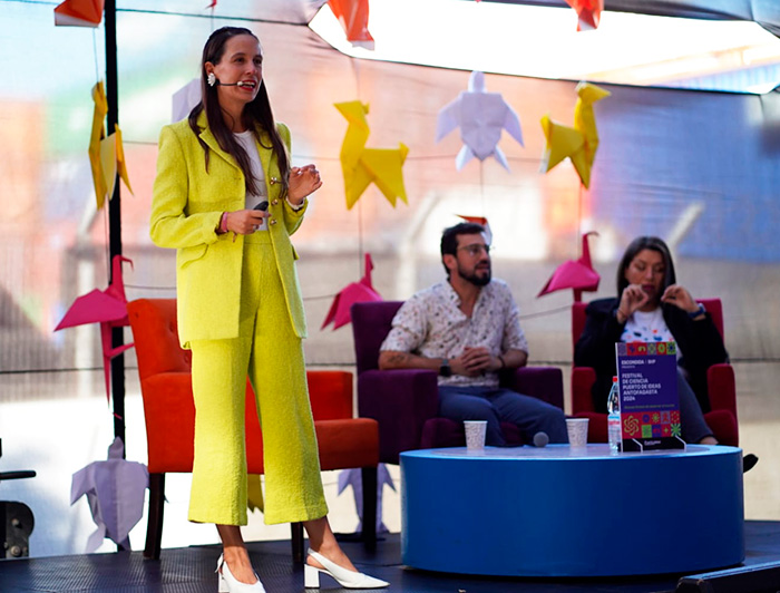 En un ámbito de investigación distinto, que podría graficarse como un viaje profundo y sin escalas al centro del cerebro, la neurocientífica Florencia Álamos -del Centro de Neurociencias de la UC y Centro de Bioética de la Facultad de Medicina- hizo su desembarco en Puerto de Ideas Antofagasta. “Mitos y verdades del cerebro adolescente” fue el nombre de su charla, en la que compartió escenario con sus colegas Gabriela Martínez e Ismael Palacios, ambos neurocientíficos. La invitación surgió del libro que co-escribieron, llamado “A 4.270 kilómetros: diario de amistades rotas, salud mental y neurociencia”, en el que participó además la investigadora Leonie Kausel.